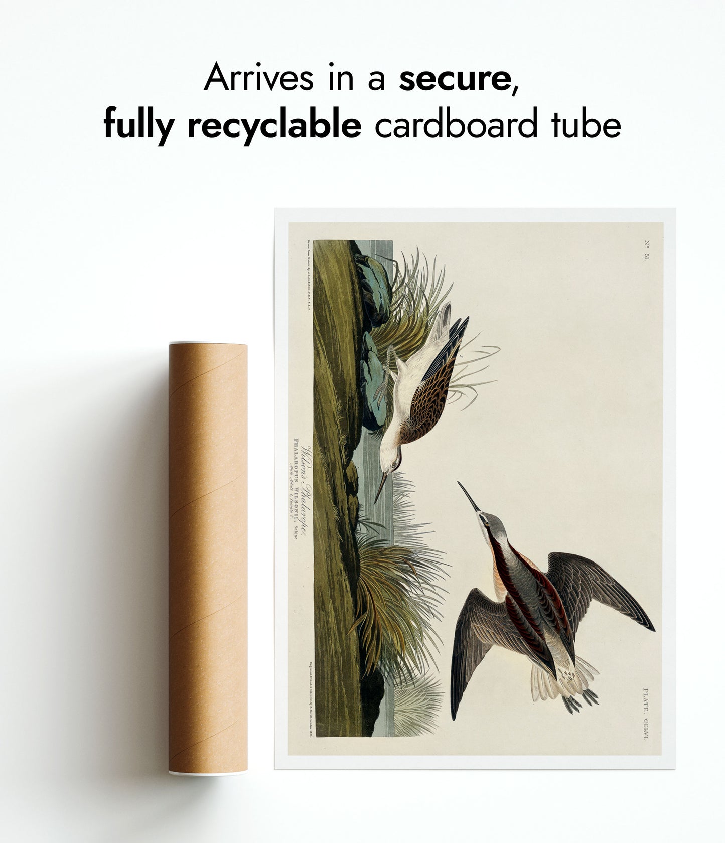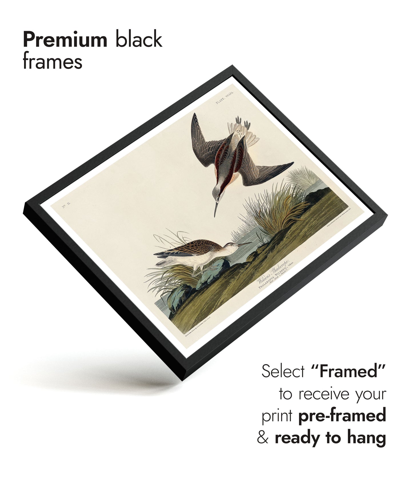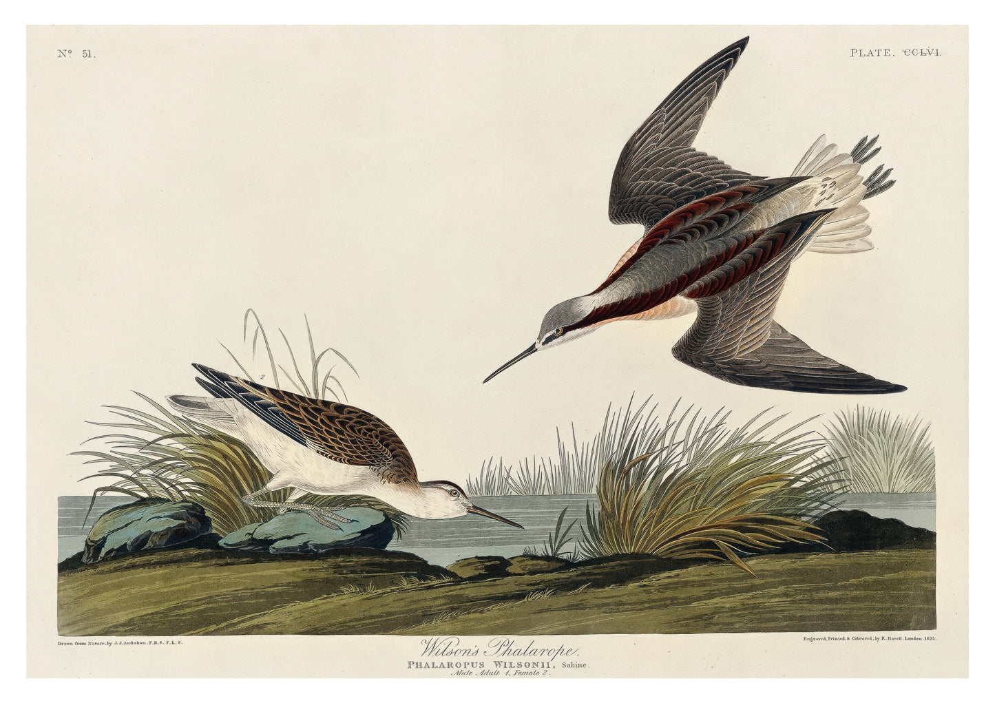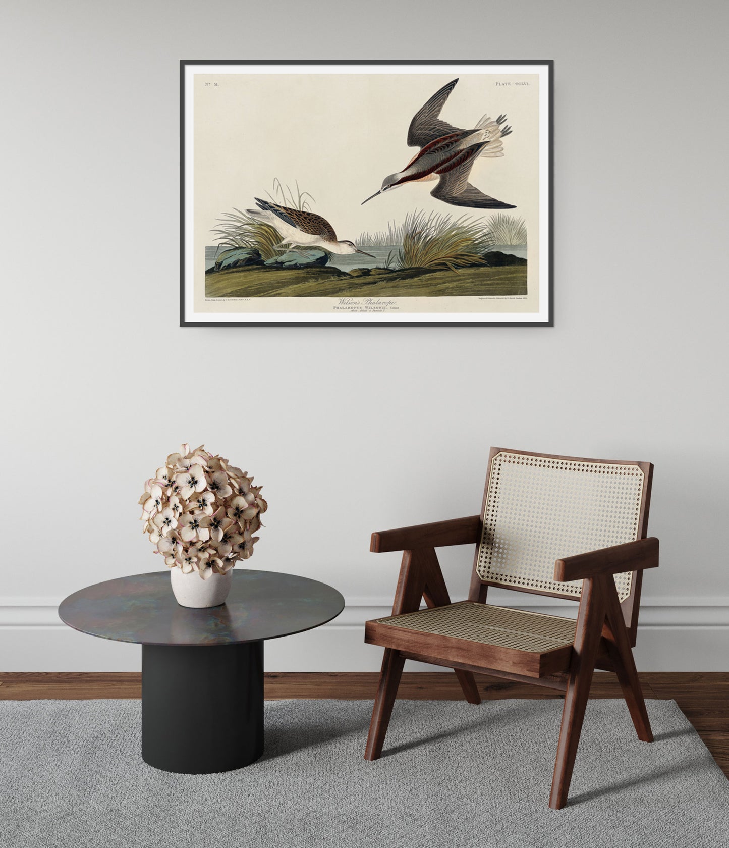 The "Wilson's Phalarope" poster by John James Audubon features a detailed illustration of two birds amidst a natural landscape. One bird flies gracefully while the other wades by the river's edge surrounded by grasses. This vintage-style print captures the essence of nature and wildlife, perfect for those appreciating zoological and ornithological art. Ideal for adding a classic touch to any space.