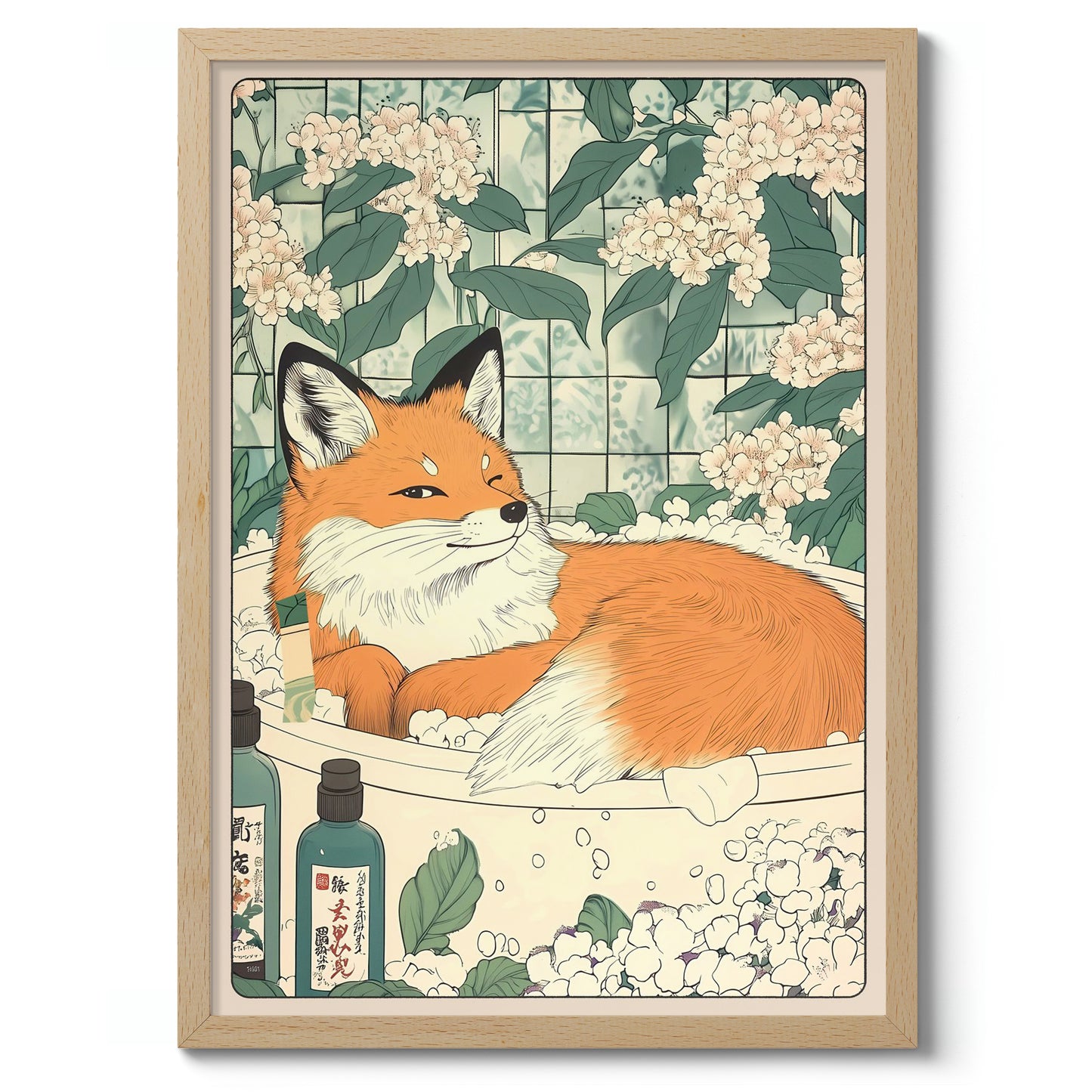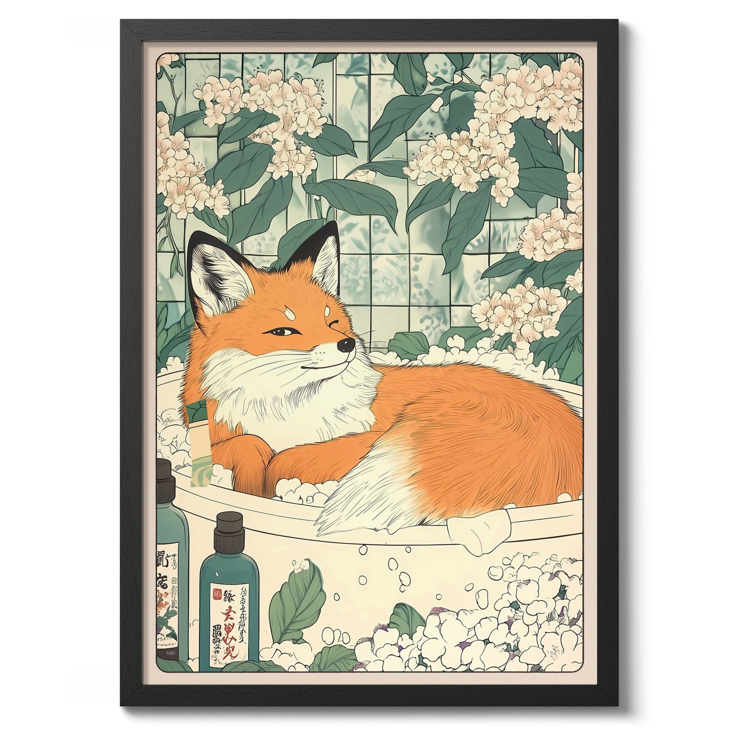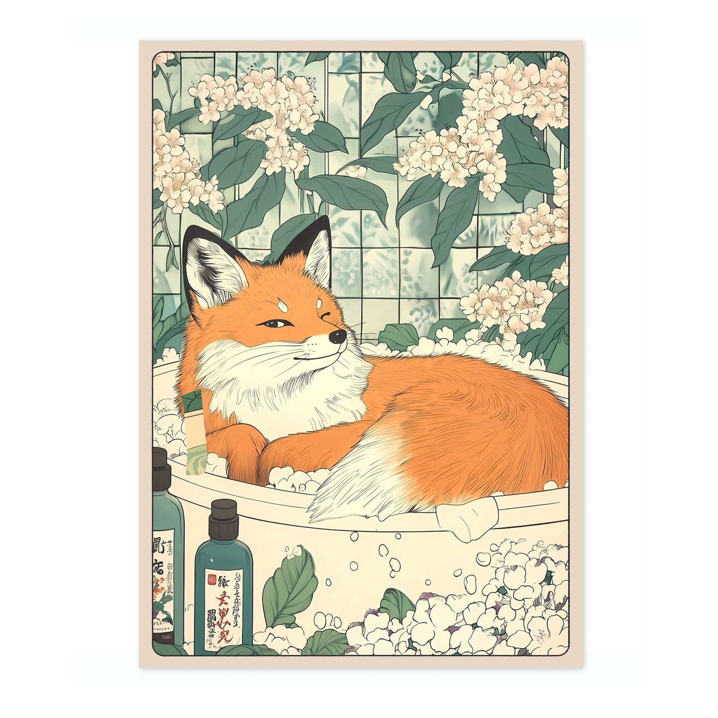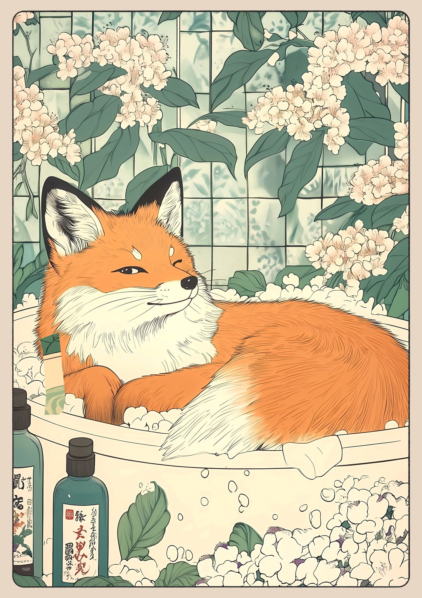 "Winking Fox Bathtime" anime poster features a playful fox reclined in a frothy, flower-adorned bath. The art blends traditional Japanese woodblock techniques with contemporary anime style, creating a charming fusion. Surrounded by delicate blossoms against a tiled backdrop, the fox exudes a whimsical vibe, perfect for those seeking unique animal-themed decor. Ideal for adding a touch of humor and elegance to any space.