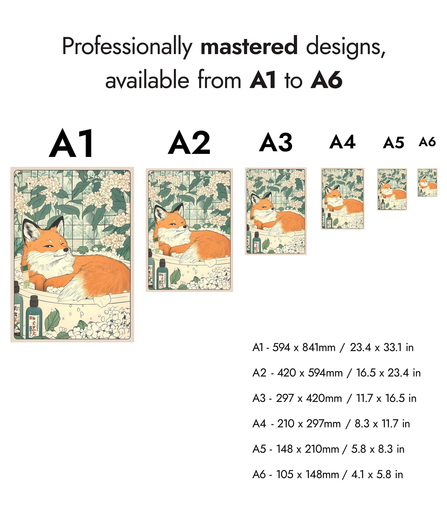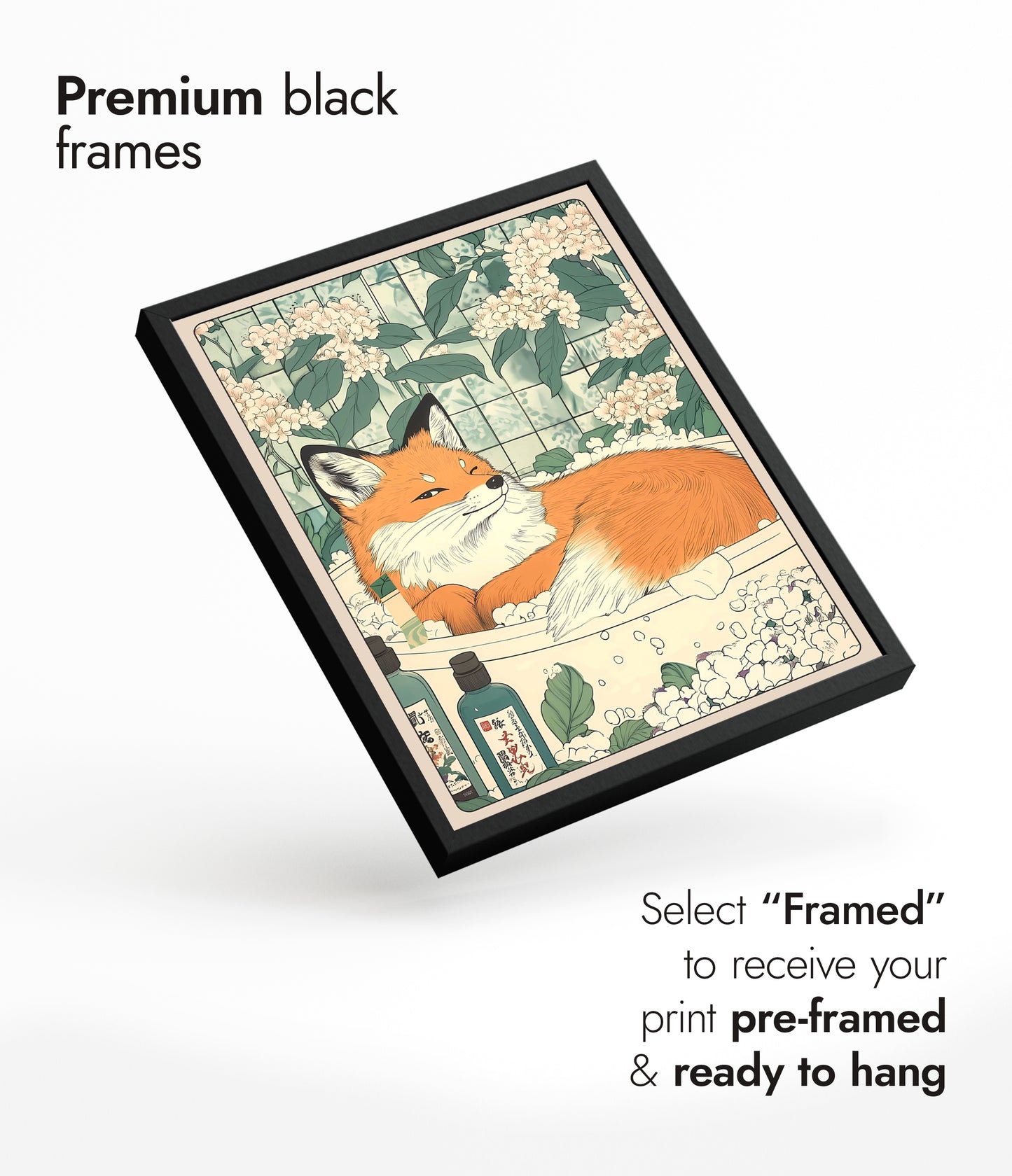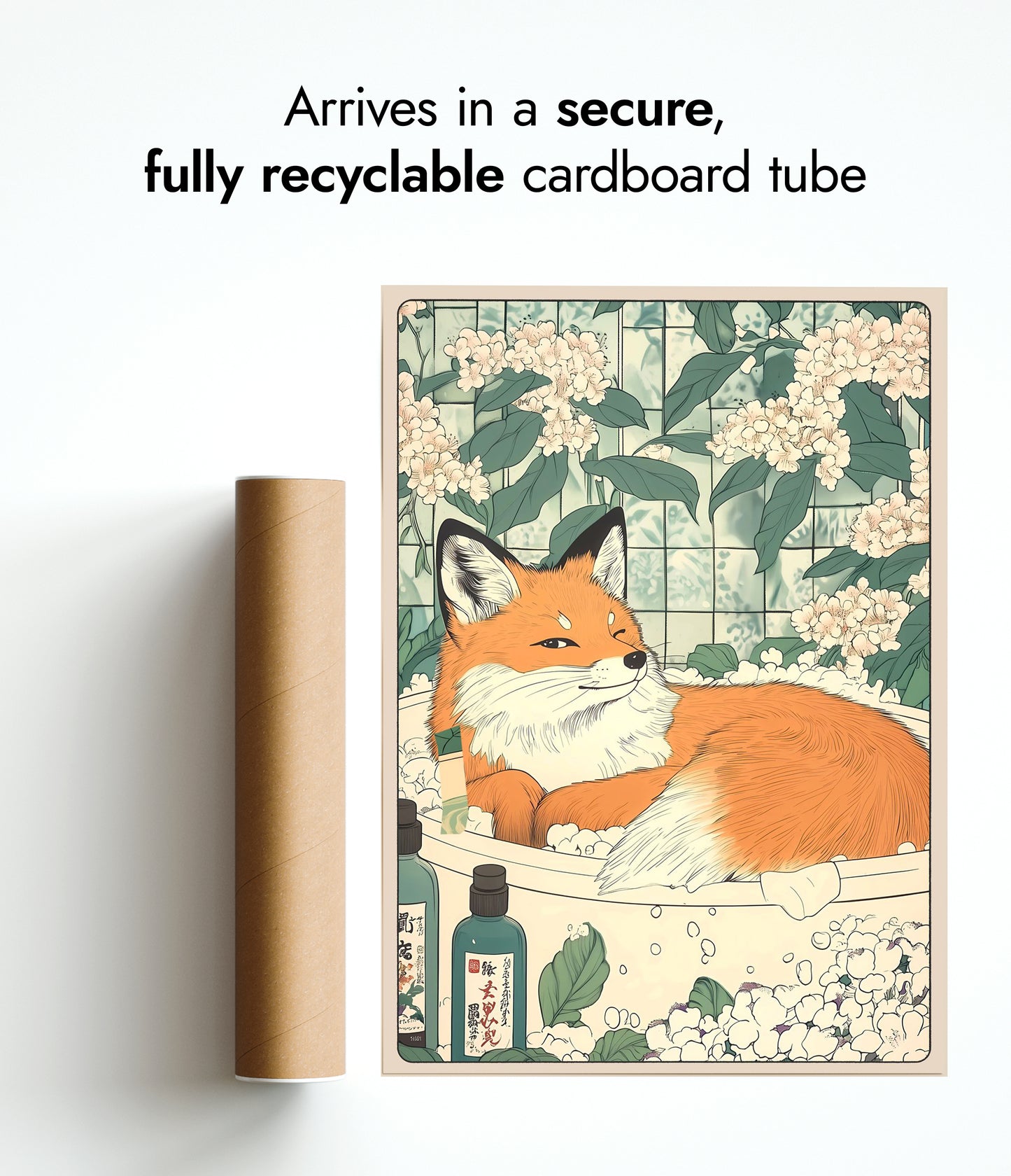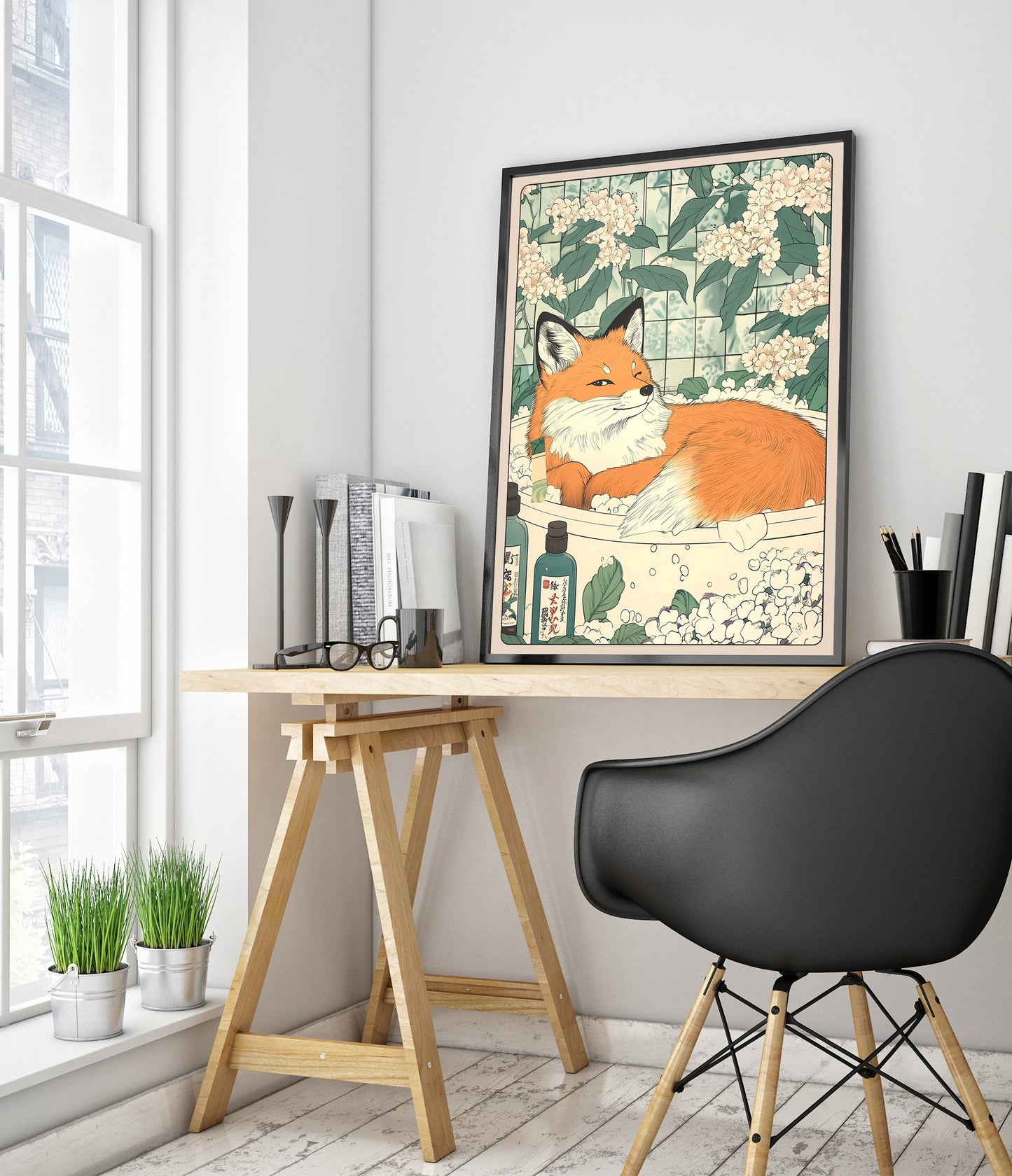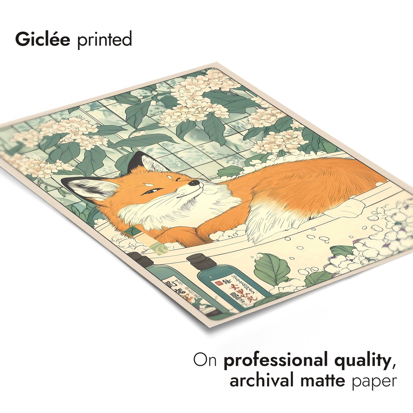 "Winking Fox Bathtime" anime poster features a playful fox reclined in a frothy, flower-adorned bath. The art blends traditional Japanese woodblock techniques with contemporary anime style, creating a charming fusion. Surrounded by delicate blossoms against a tiled backdrop, the fox exudes a whimsical vibe, perfect for those seeking unique animal-themed decor. Ideal for adding a touch of humor and elegance to any space.