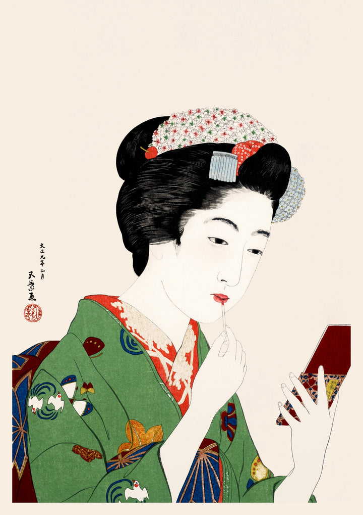 This "Woman Applying Rouge" poster showcases a traditional Japanese woodblock print by Goyo Hashiguchi. It highlights a serene moment with a woman in a green kimono adorned with intricate patterns, carefully applying makeup. The delicate brushwork and vibrant colours capture the elegance of the Ukiyo-e style, making this portrait a timeless piece of Japanese art.