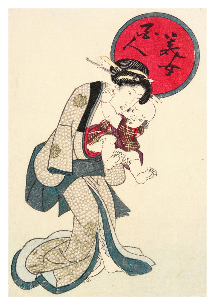 This "Woman Holding a Baby" poster by Utagawa Kunisada exquisitely captures a tender moment in traditional Japanese woodblock style. The detailed illustration features a mother embracing her child, highlighting the bond between them. The vivid red circle and intricate patterns on their clothing enhance the traditional Ukiyo-e aesthetic, perfect for admirers of classic Japanese art prints.