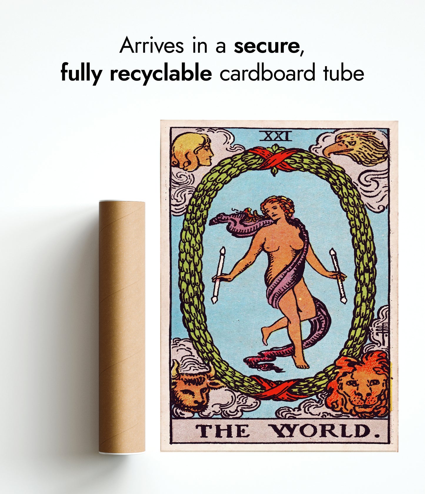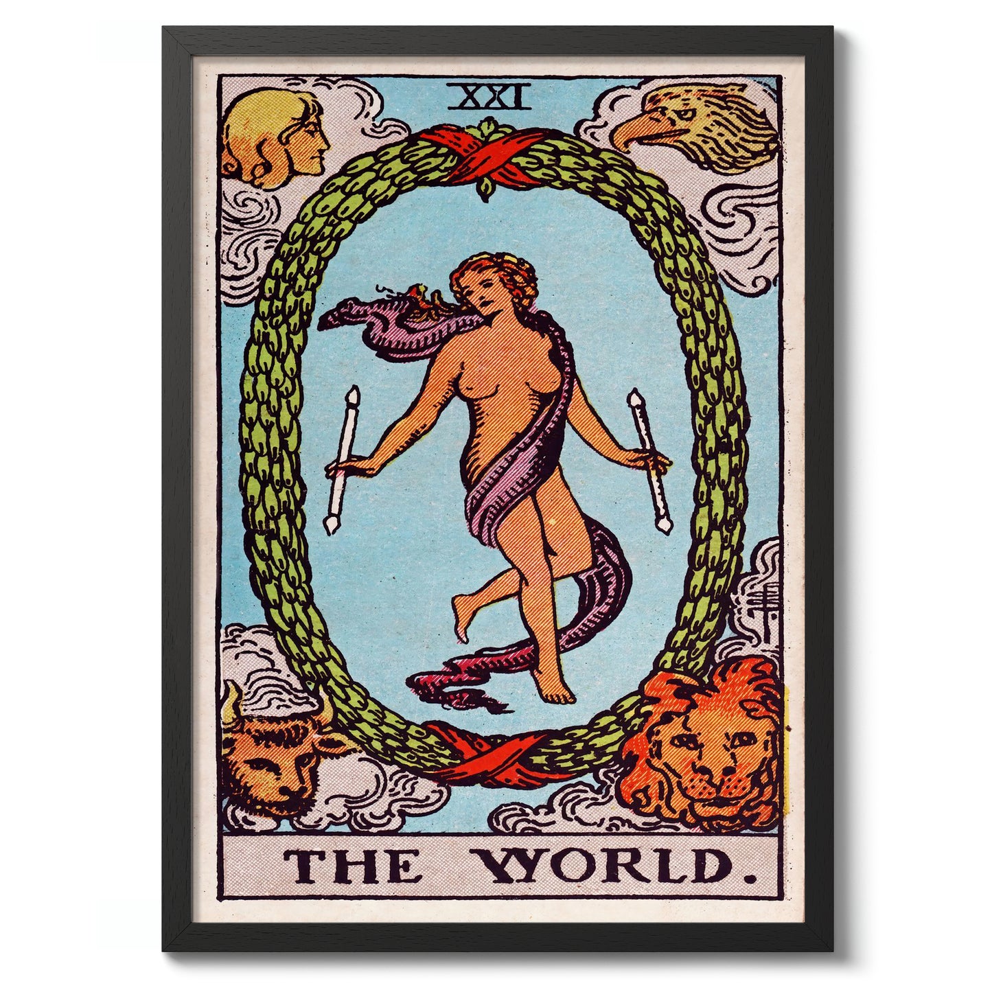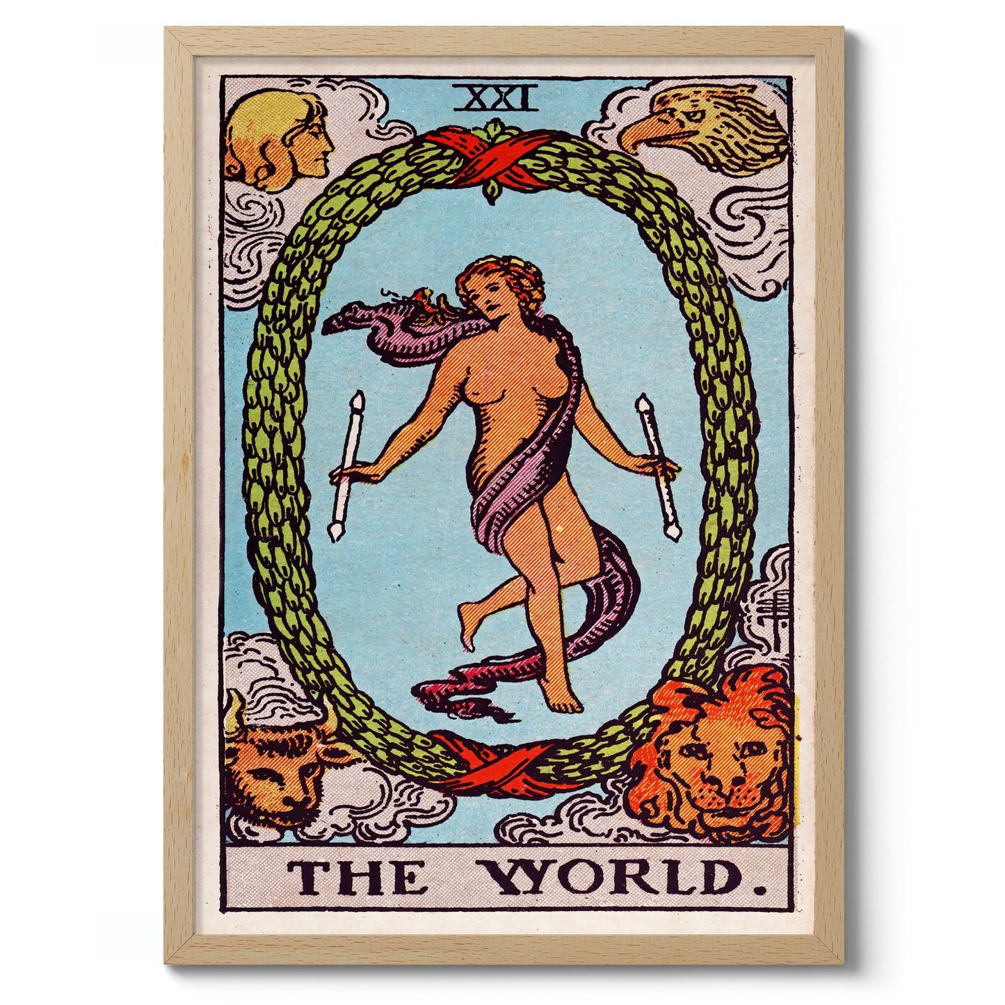 The "World" tarot card poster beautifully encapsulates spiritual unity and completion. Illustrated in a vintage style, it features a central figure, an angelic nude woman dancing with two wands, encircled by a verdant wreath. Surrounding her are symbols of strength and wisdom—a lion, bull, eagle, and man, enhancing the spiritual depth of this multicolored artwork. Perfect for those interested in tarot and spirituality.