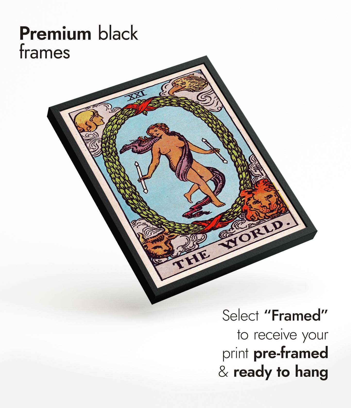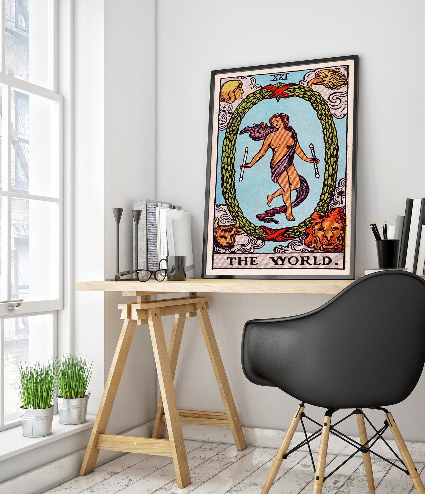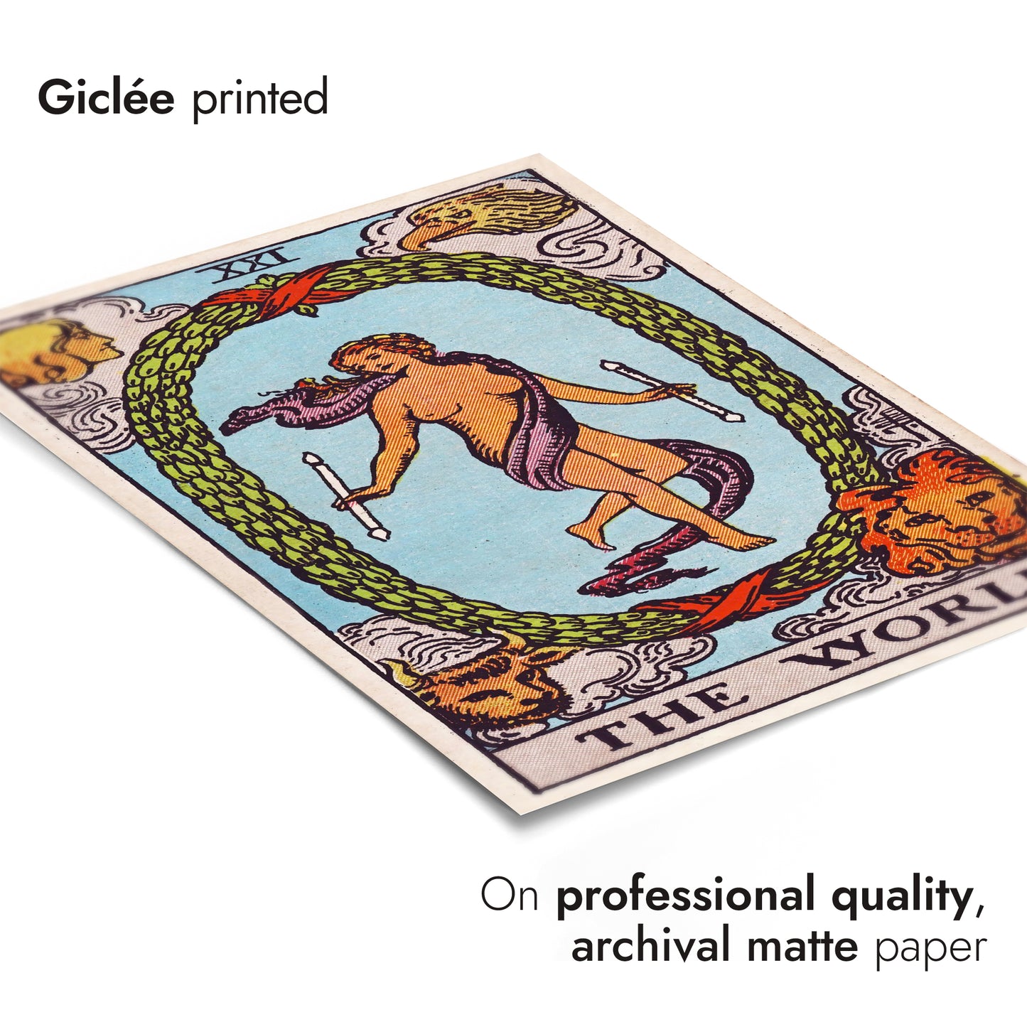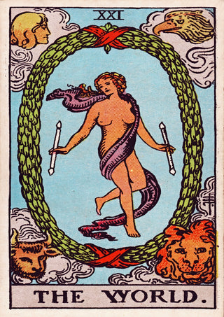 The "World" tarot card poster beautifully encapsulates spiritual unity and completion. Illustrated in a vintage style, it features a central figure, an angelic nude woman dancing with two wands, encircled by a verdant wreath. Surrounding her are symbols of strength and wisdom—a lion, bull, eagle, and man, enhancing the spiritual depth of this multicolored artwork. Perfect for those interested in tarot and spirituality.