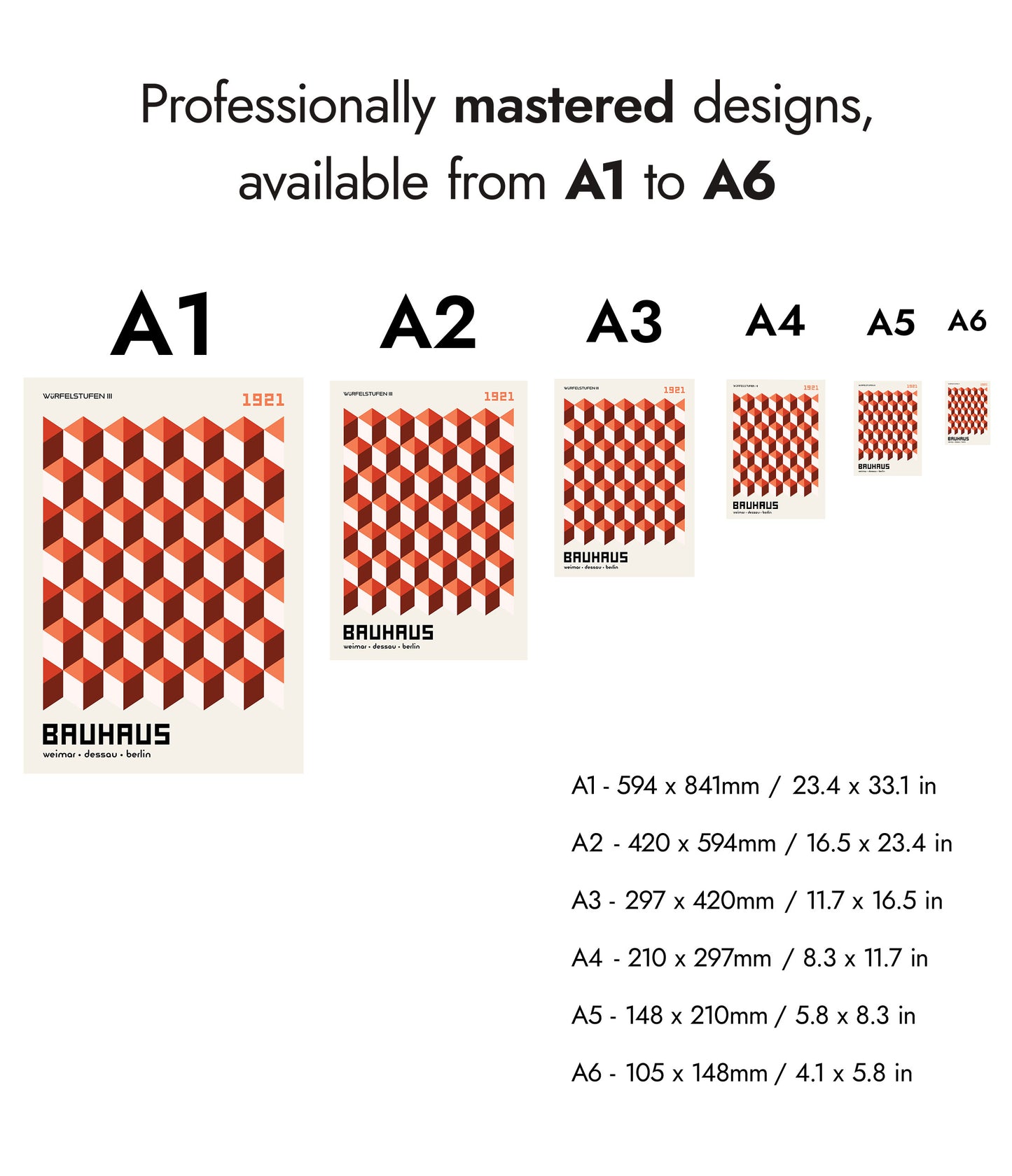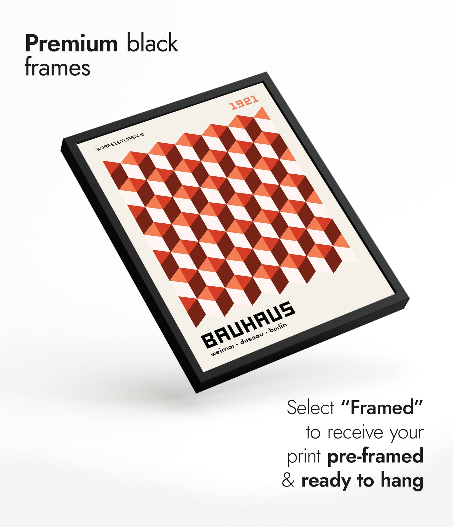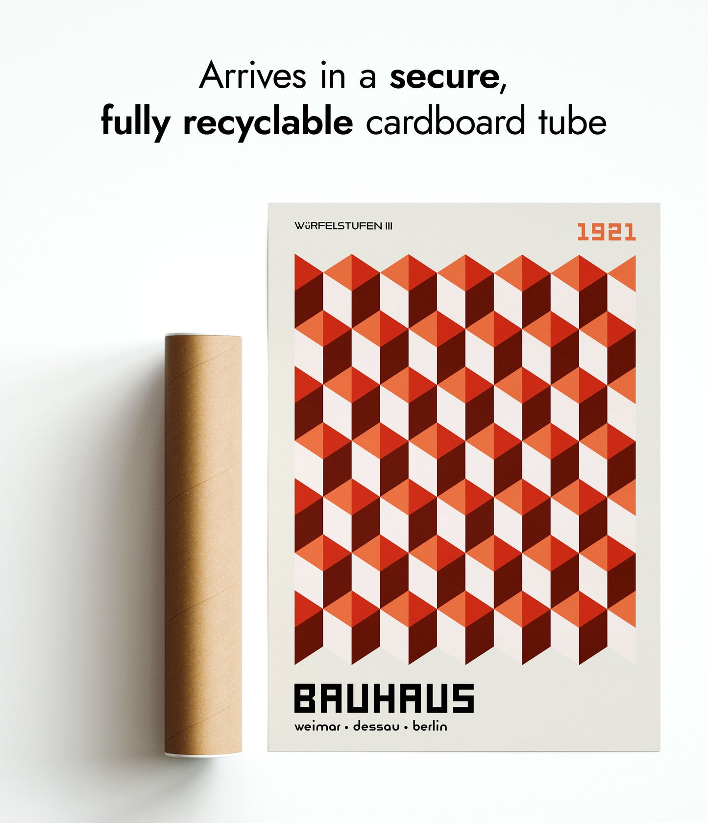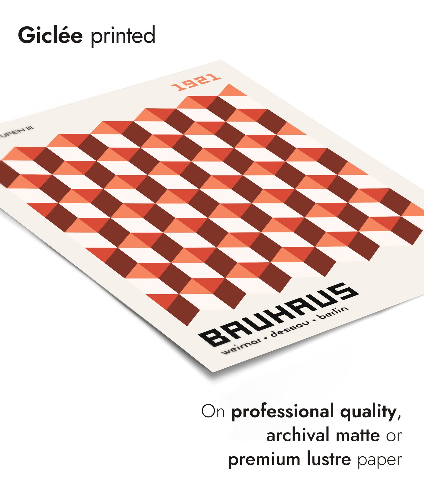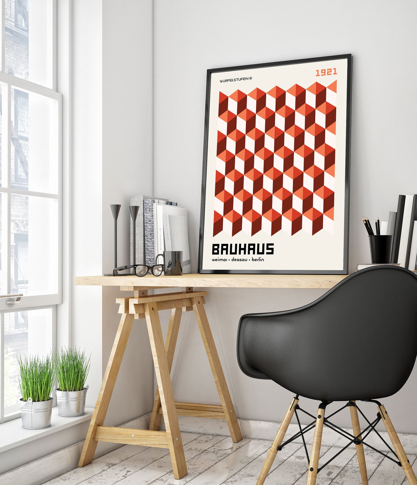 This "Würfelstufen, in Orange" poster embodies the geometric precision and abstract aesthetic of the Bauhaus movement. Featuring an arrangement of orange and red 3D cubes, it captures the essence of 1921 modernist design. Ideal for those who appreciate mid-century and modern Bauhaus styles, this portrait poster adds a dynamic visual element to any space featuring abstract shapes.