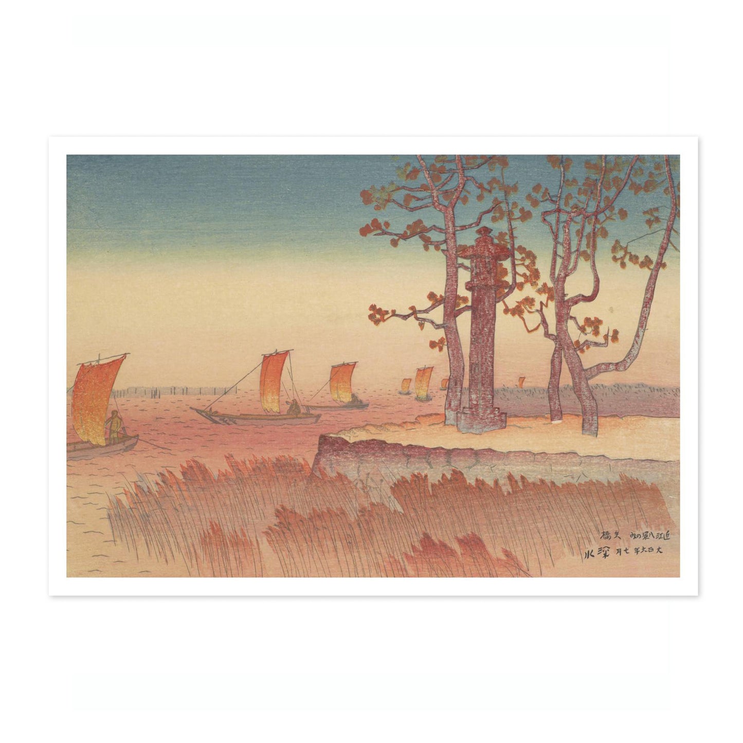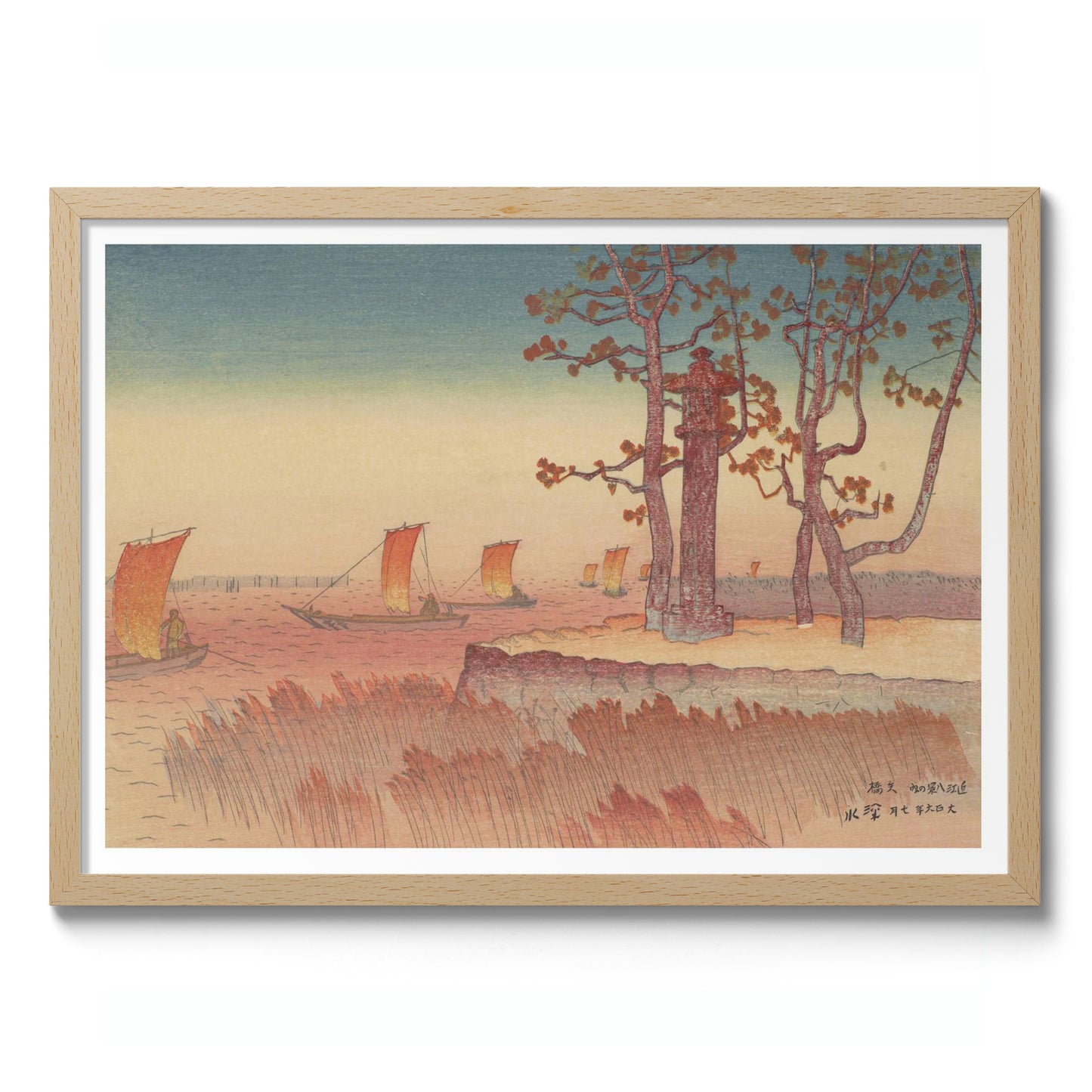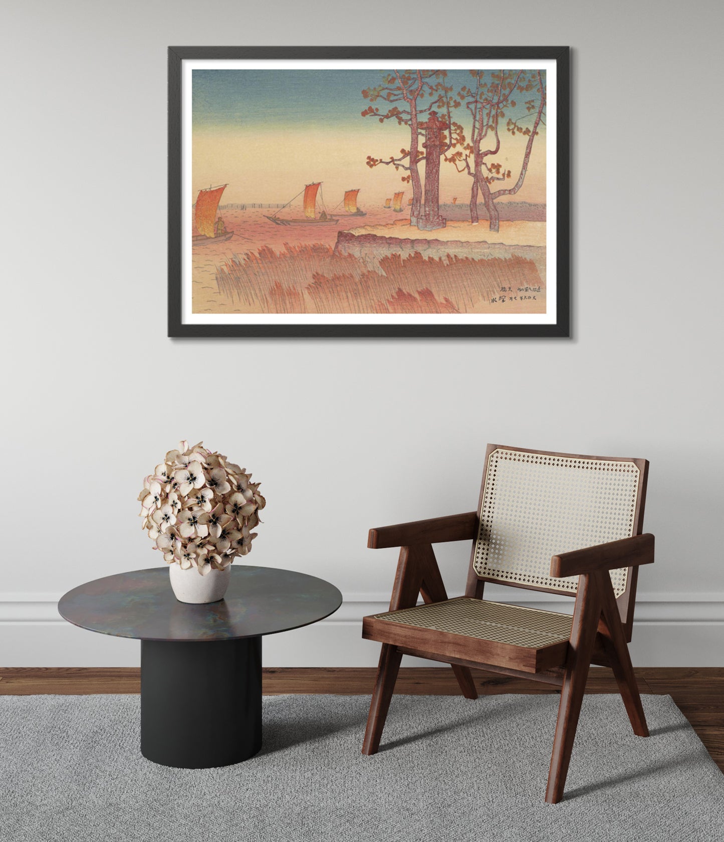 The "Yabase" poster by Shinsui Ito, created in 1917, is a traditional Japanese woodblock print featuring a serene harbor scene. Highlighting ukiyo-e and shin-hanga styles, it captures sailboats gliding through a tranquil sea at sunset. The artwork's rich orange and blue hues blend with delicately rendered trees, creating a harmonious composition that reflects Japan's natural beauty and timeless artistry.