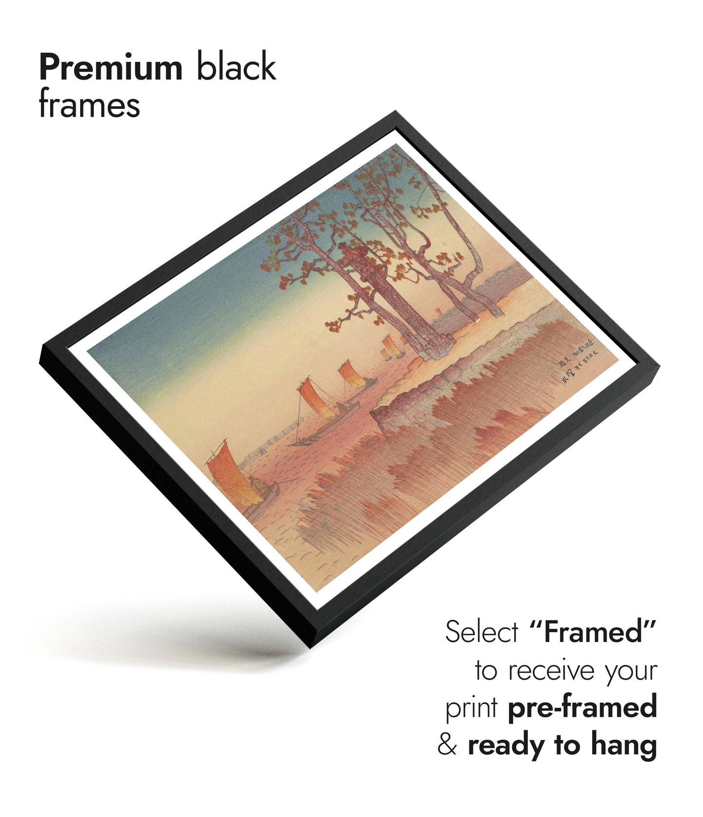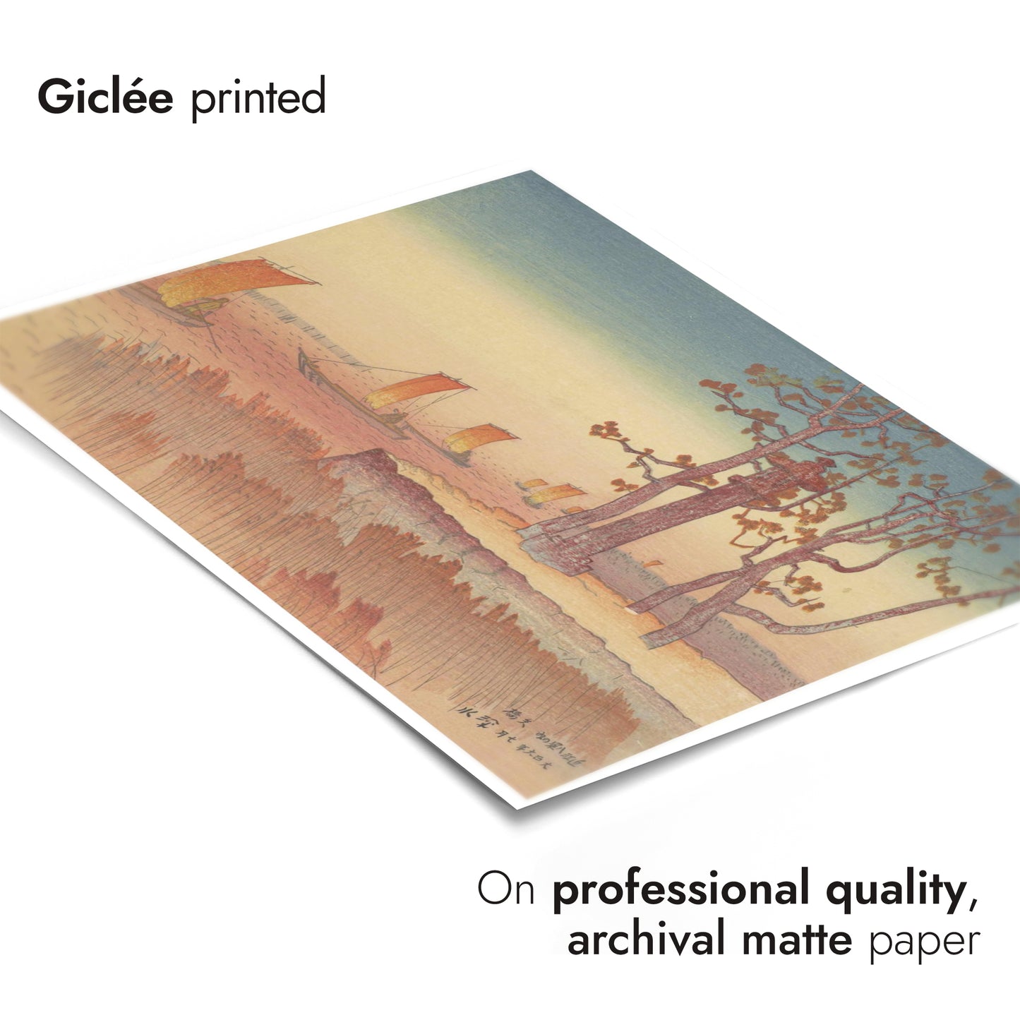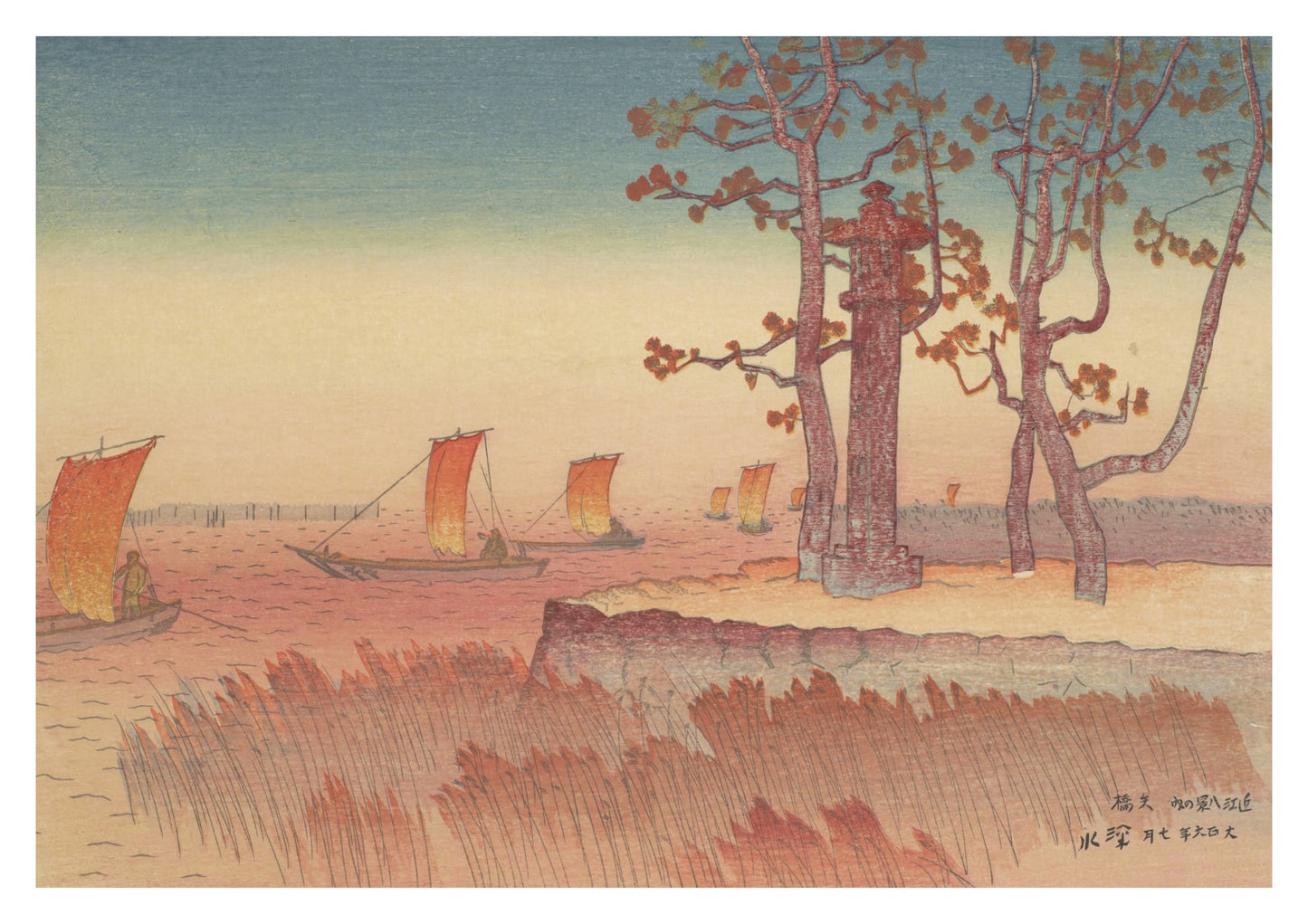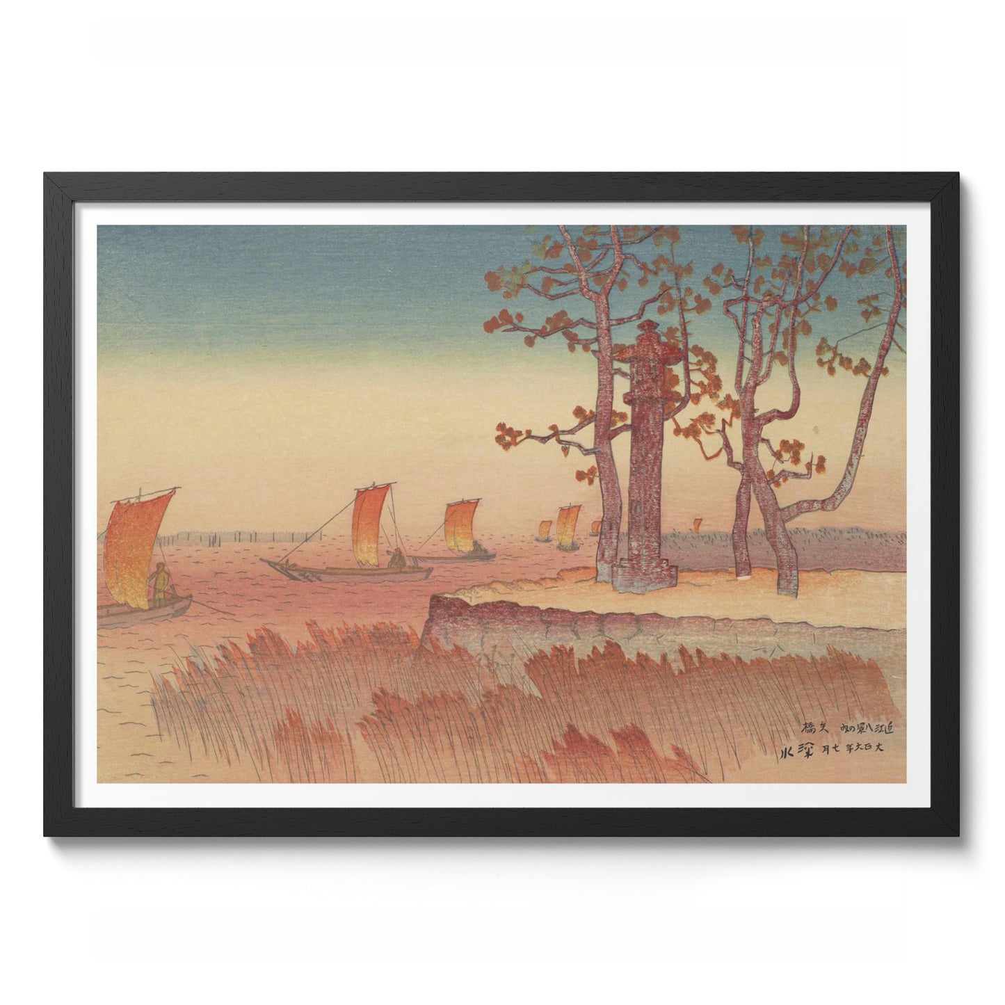 The "Yabase" poster by Shinsui Ito, created in 1917, is a traditional Japanese woodblock print featuring a serene harbor scene. Highlighting ukiyo-e and shin-hanga styles, it captures sailboats gliding through a tranquil sea at sunset. The artwork's rich orange and blue hues blend with delicately rendered trees, creating a harmonious composition that reflects Japan's natural beauty and timeless artistry.