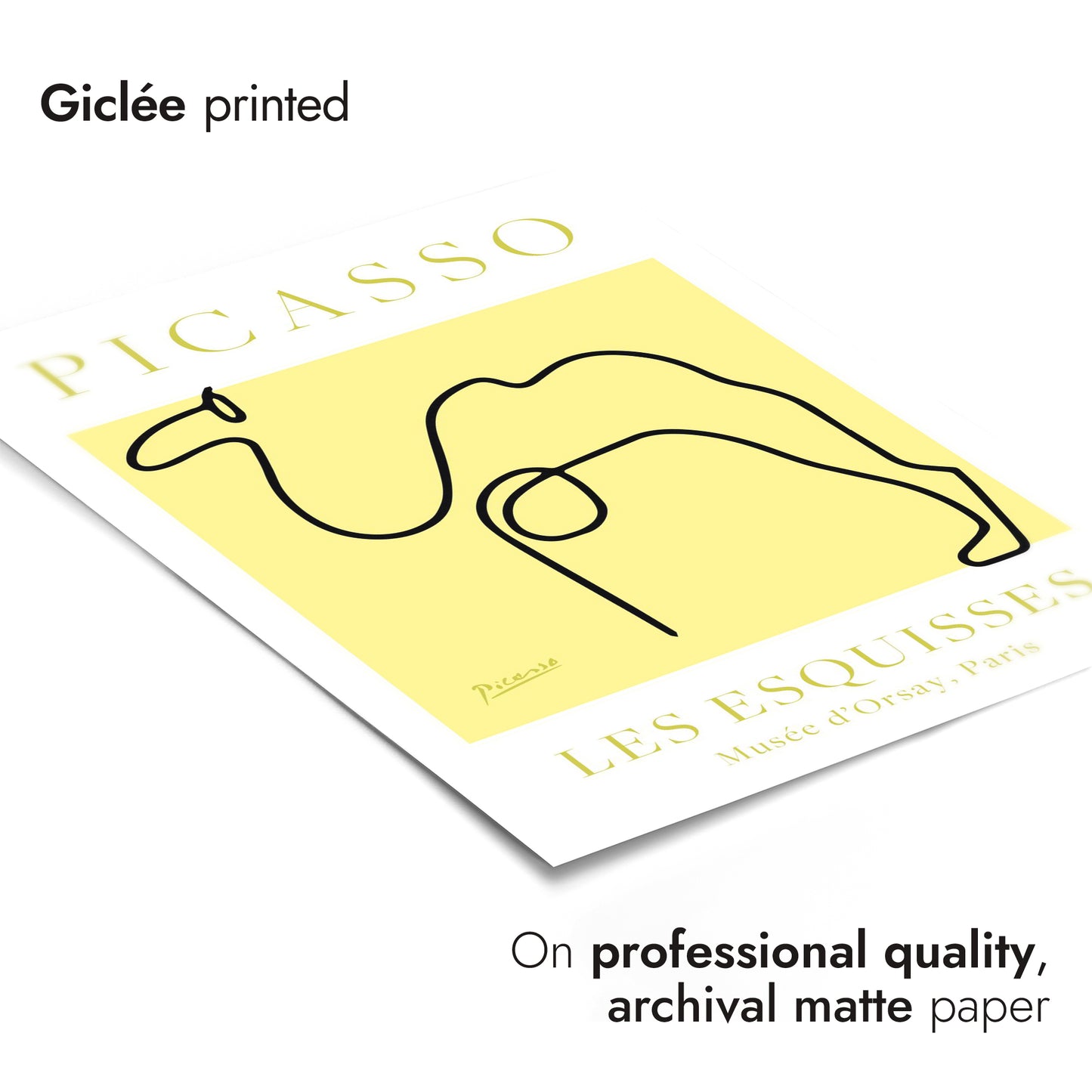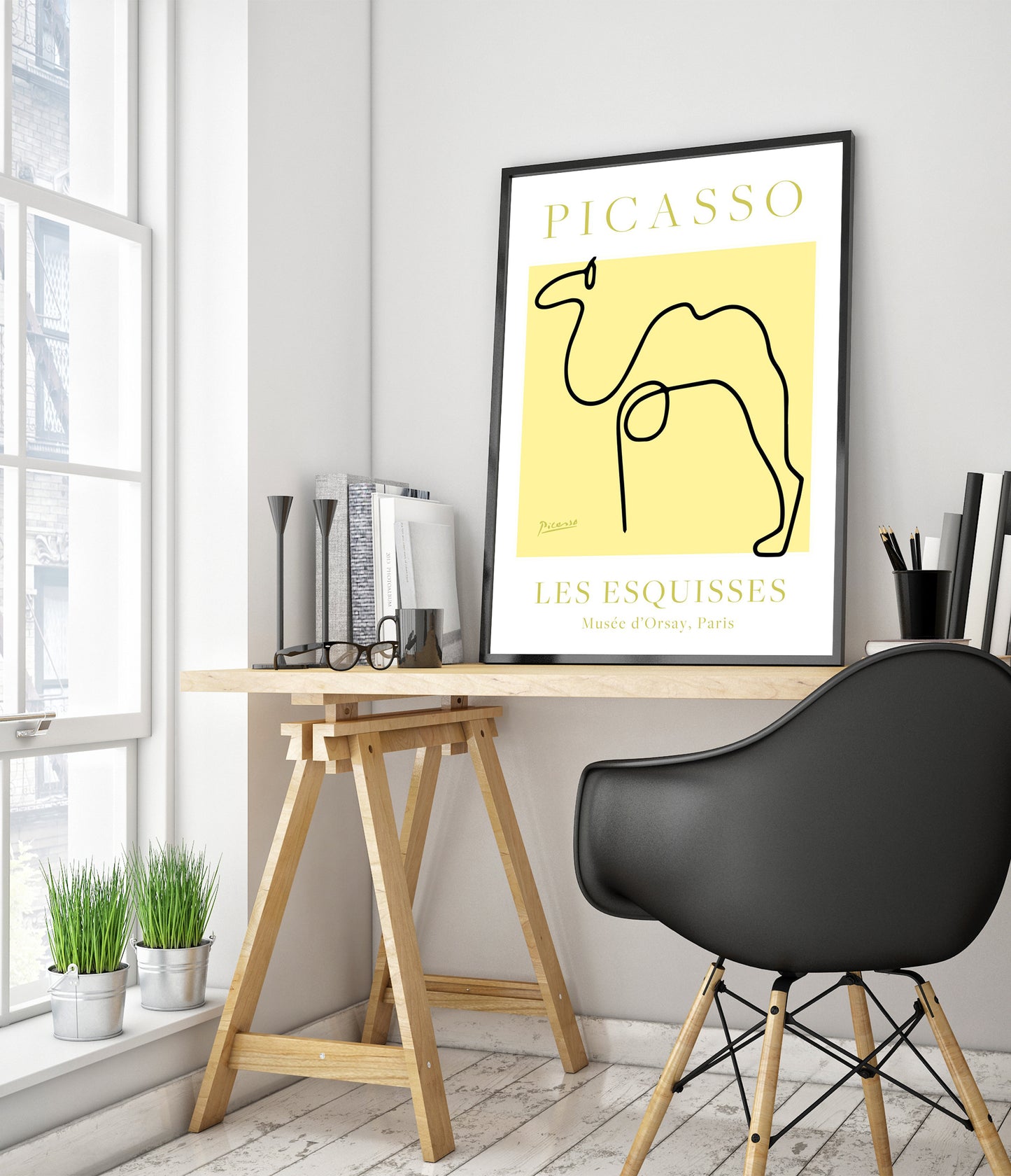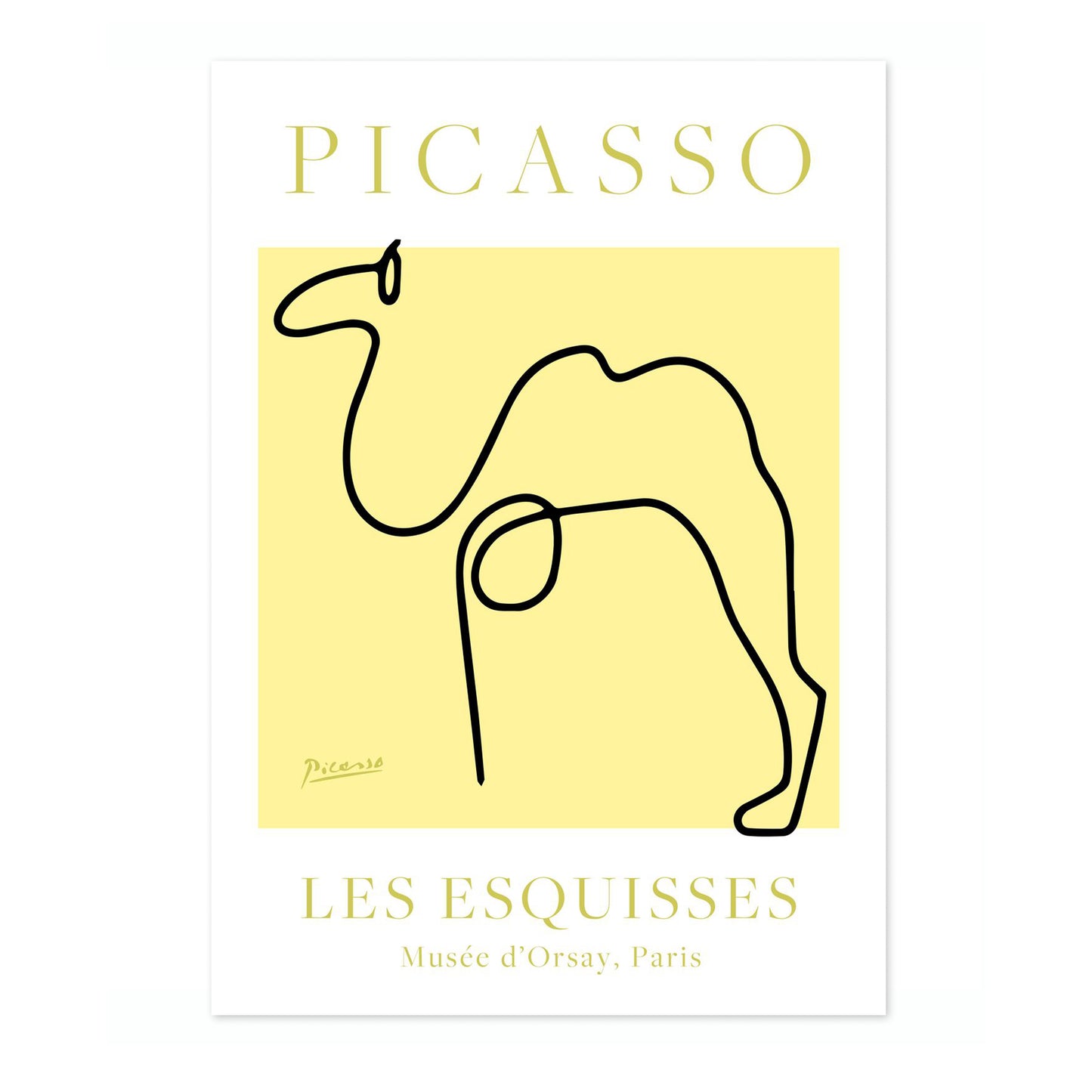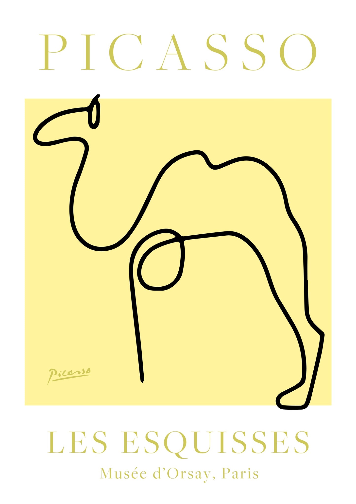 This Picasso poster, titled "Yellow & White Camel," features minimalist line art that captures the essence of a camel with elegant simplicity. Set against a yellow backdrop, the abstract illustration emphasizes fluid lines and form, evoking the desert theme. Ideal for art enthusiasts seeking a touch of refined modernity, this poster is a testament to Picasso's innovative style.