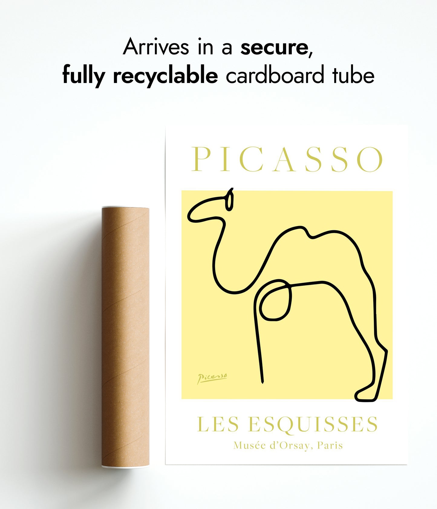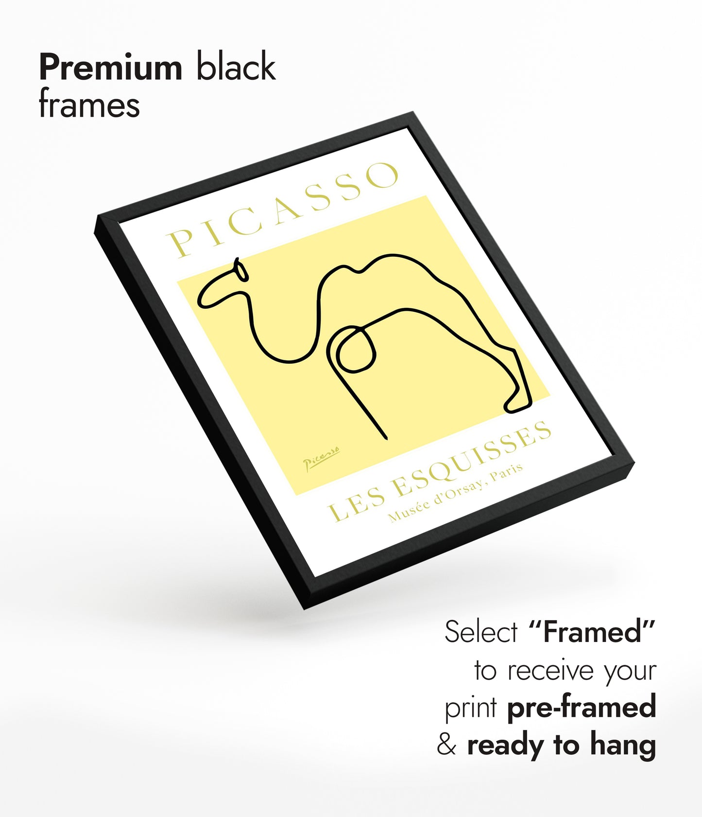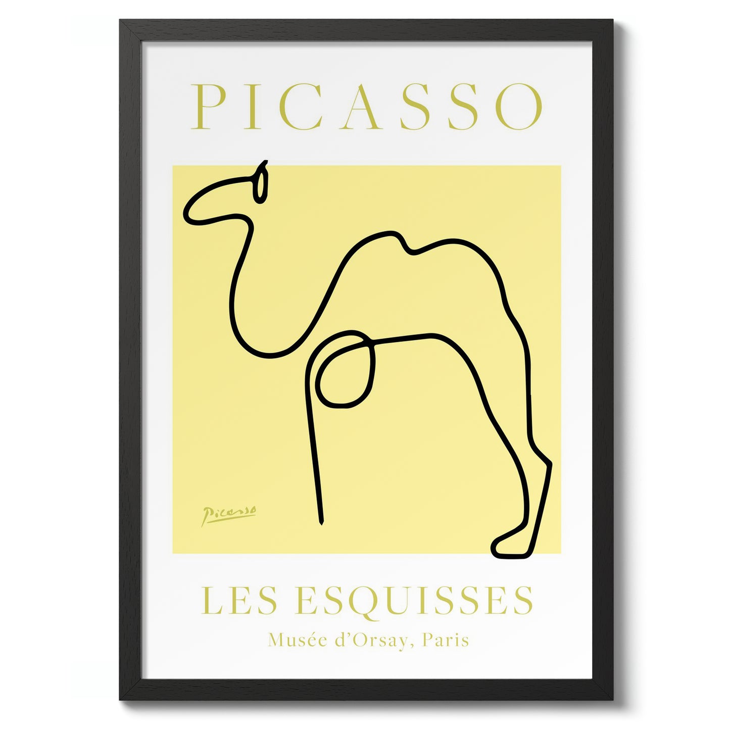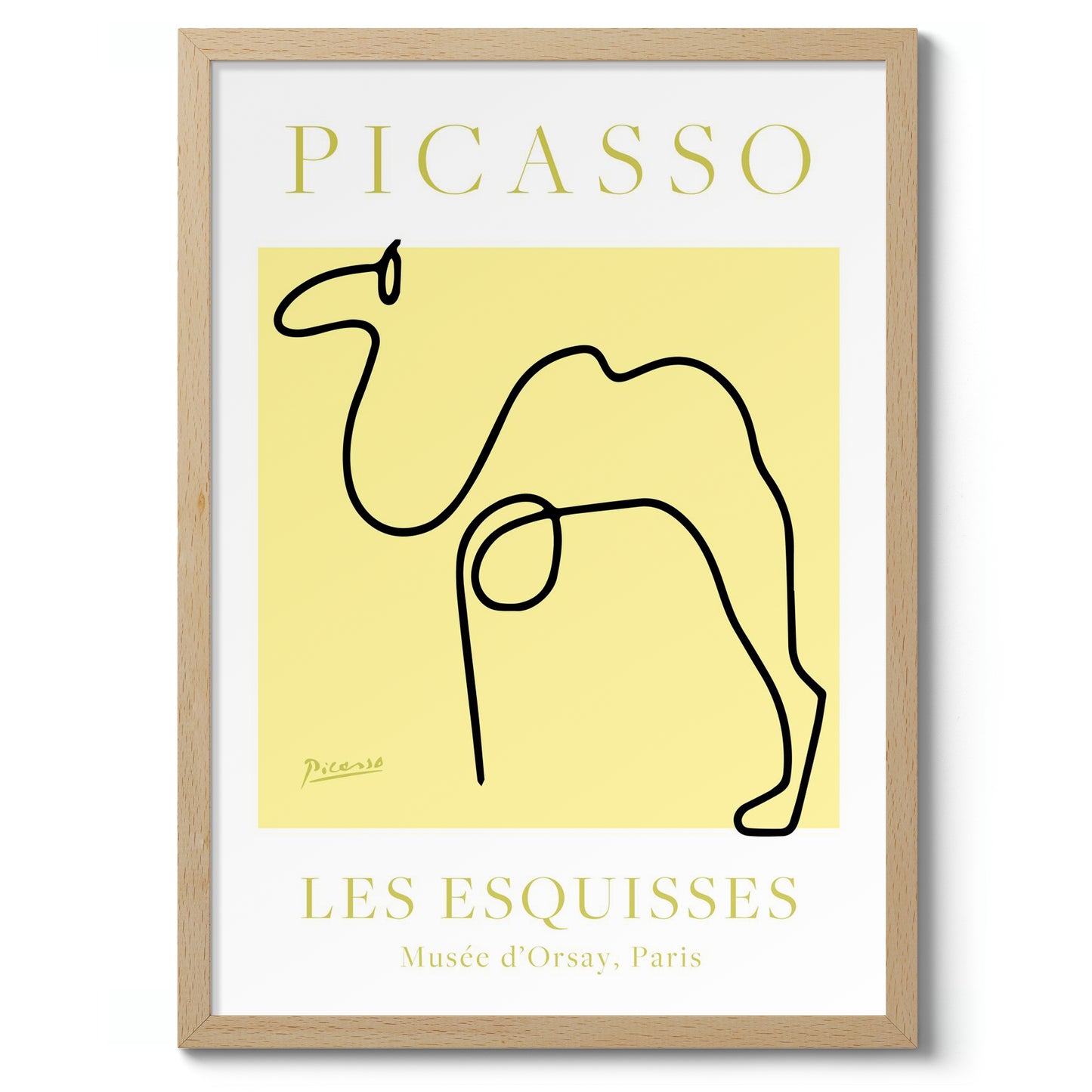 This Picasso poster, titled "Yellow & White Camel," features minimalist line art that captures the essence of a camel with elegant simplicity. Set against a yellow backdrop, the abstract illustration emphasizes fluid lines and form, evoking the desert theme. Ideal for art enthusiasts seeking a touch of refined modernity, this poster is a testament to Picasso's innovative style.