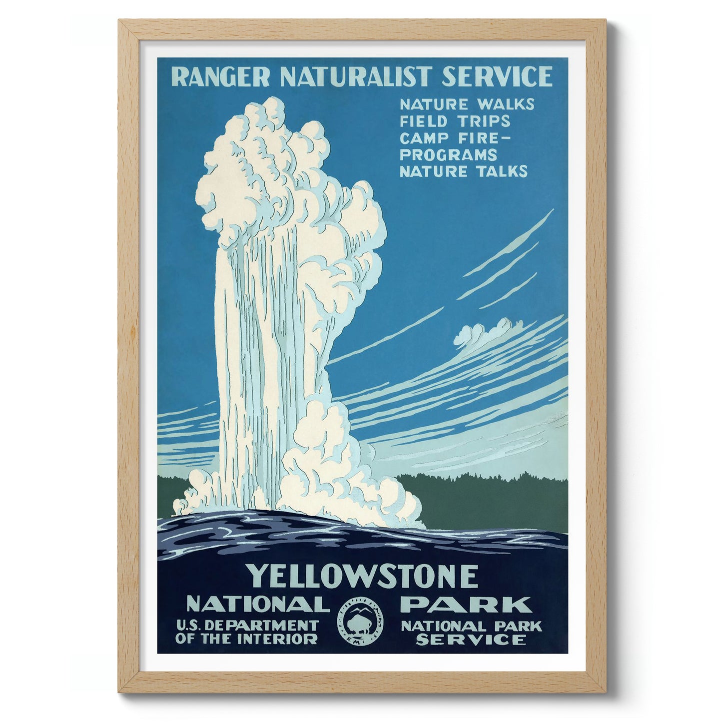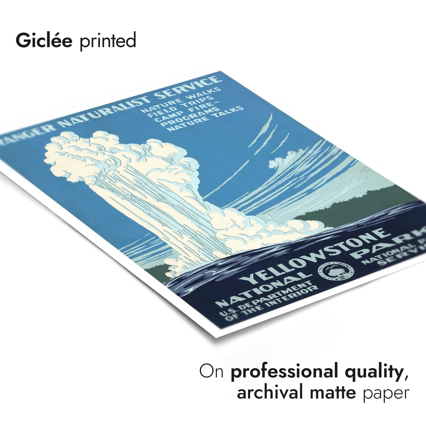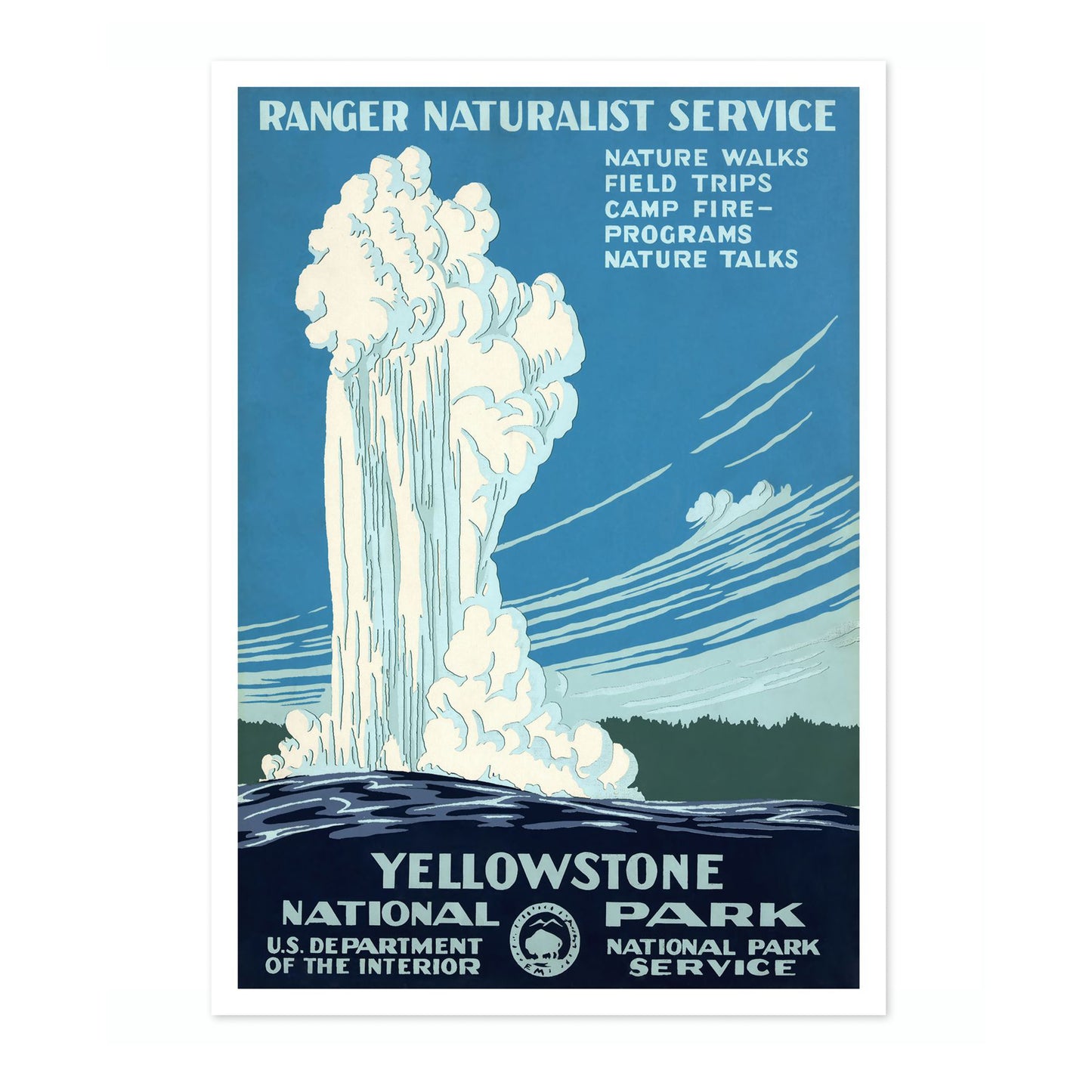 This vintage Yellowstone National Park poster beautifully illustrates a geyser eruption against a blue sky. Featuring bold text promoting ranger-led nature activities, the artwork captures the essence of Yellowstone's natural wonders. Ideal for nature lovers, its dynamic depiction of water and landscape evokes adventure and exploration, making it a timeless addition to any wall.