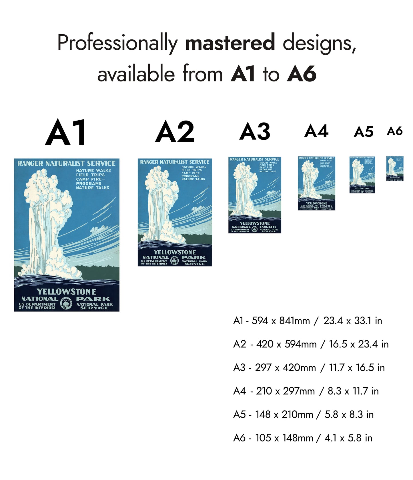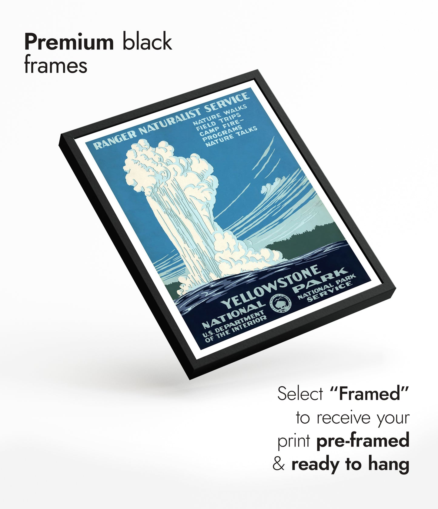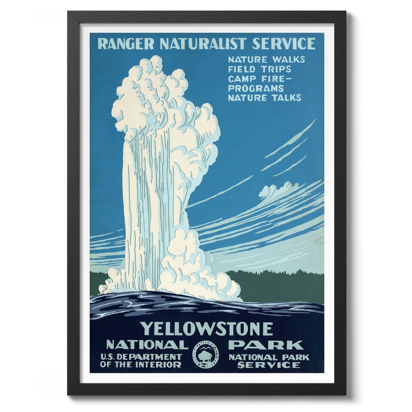 This vintage Yellowstone National Park poster beautifully illustrates a geyser eruption against a blue sky. Featuring bold text promoting ranger-led nature activities, the artwork captures the essence of Yellowstone's natural wonders. Ideal for nature lovers, its dynamic depiction of water and landscape evokes adventure and exploration, making it a timeless addition to any wall.