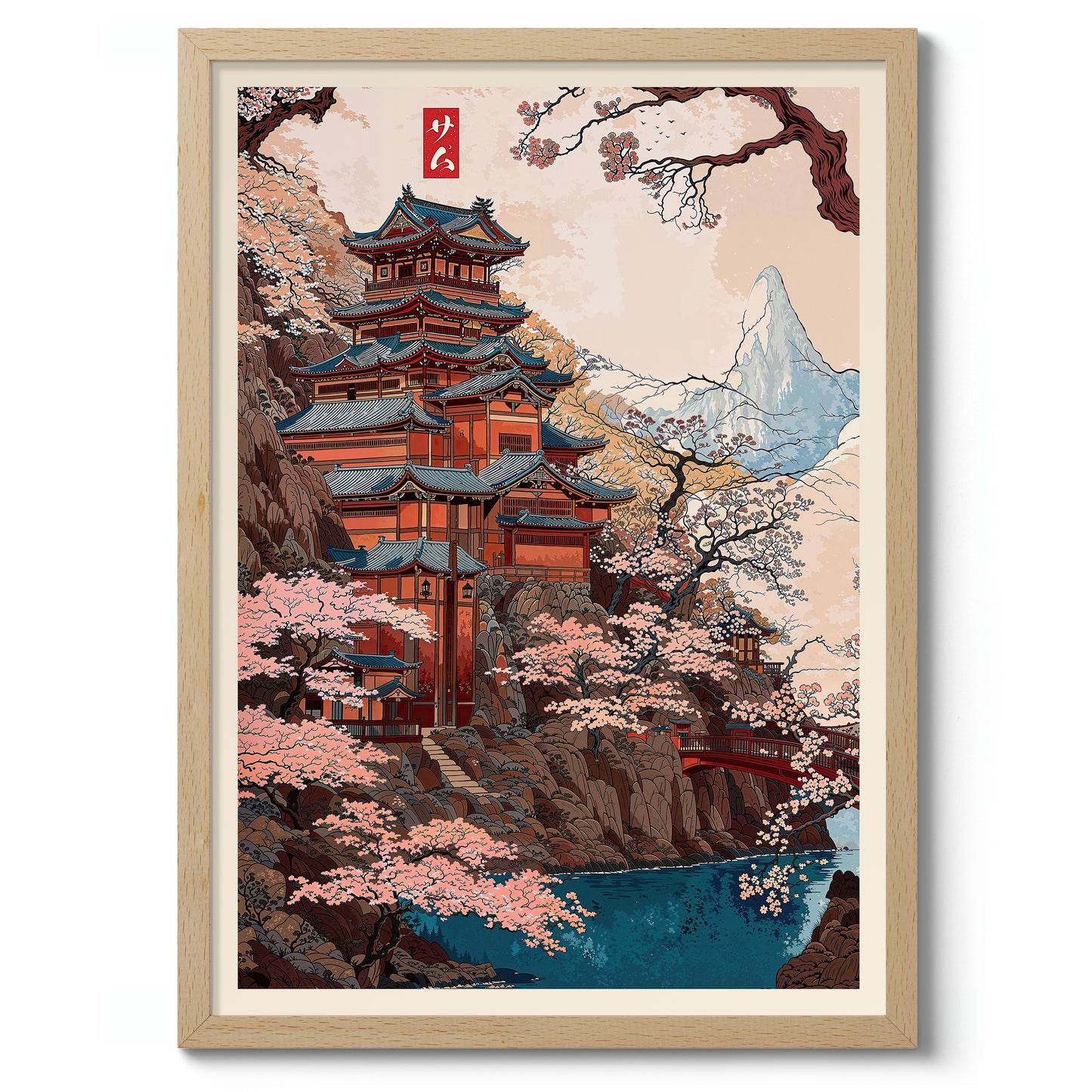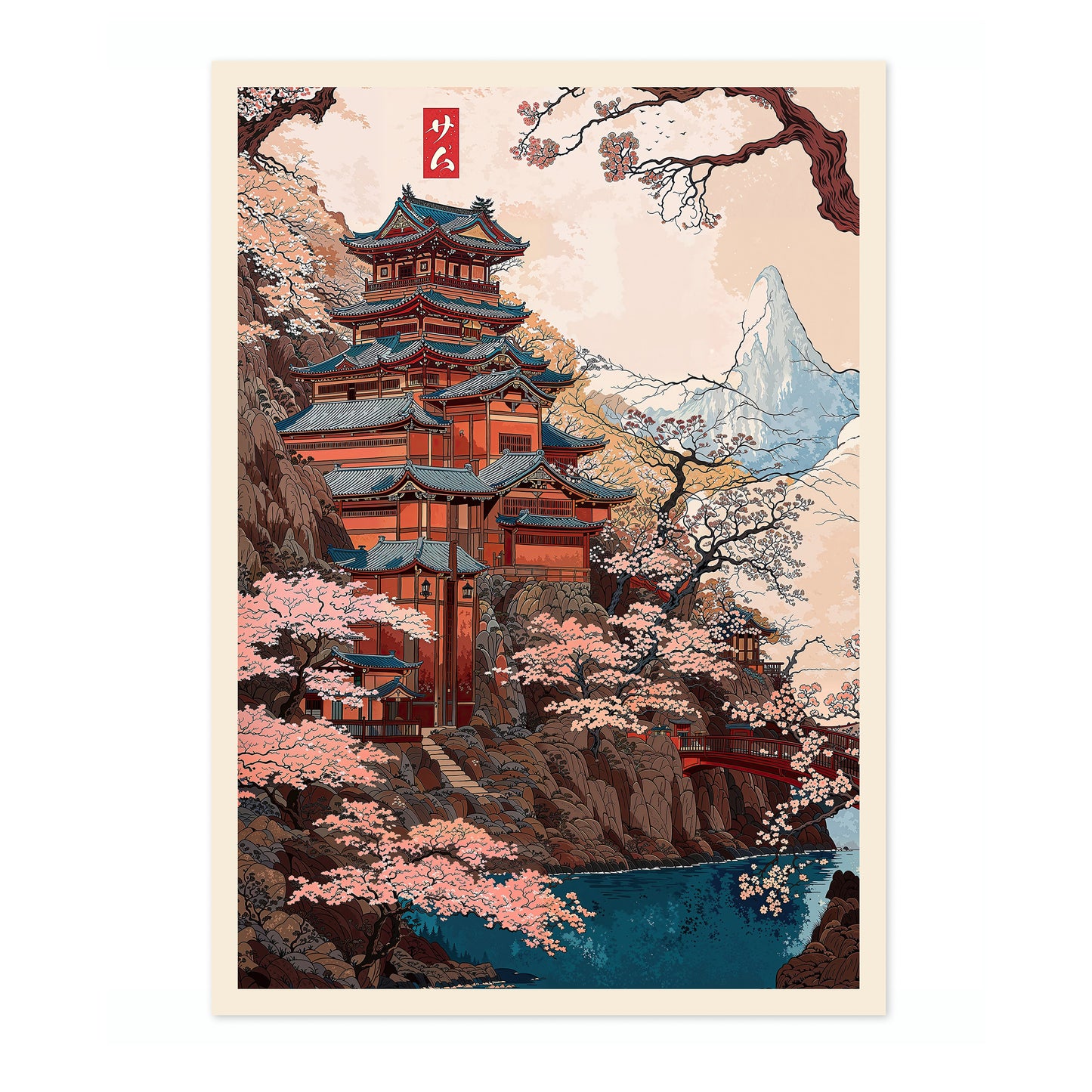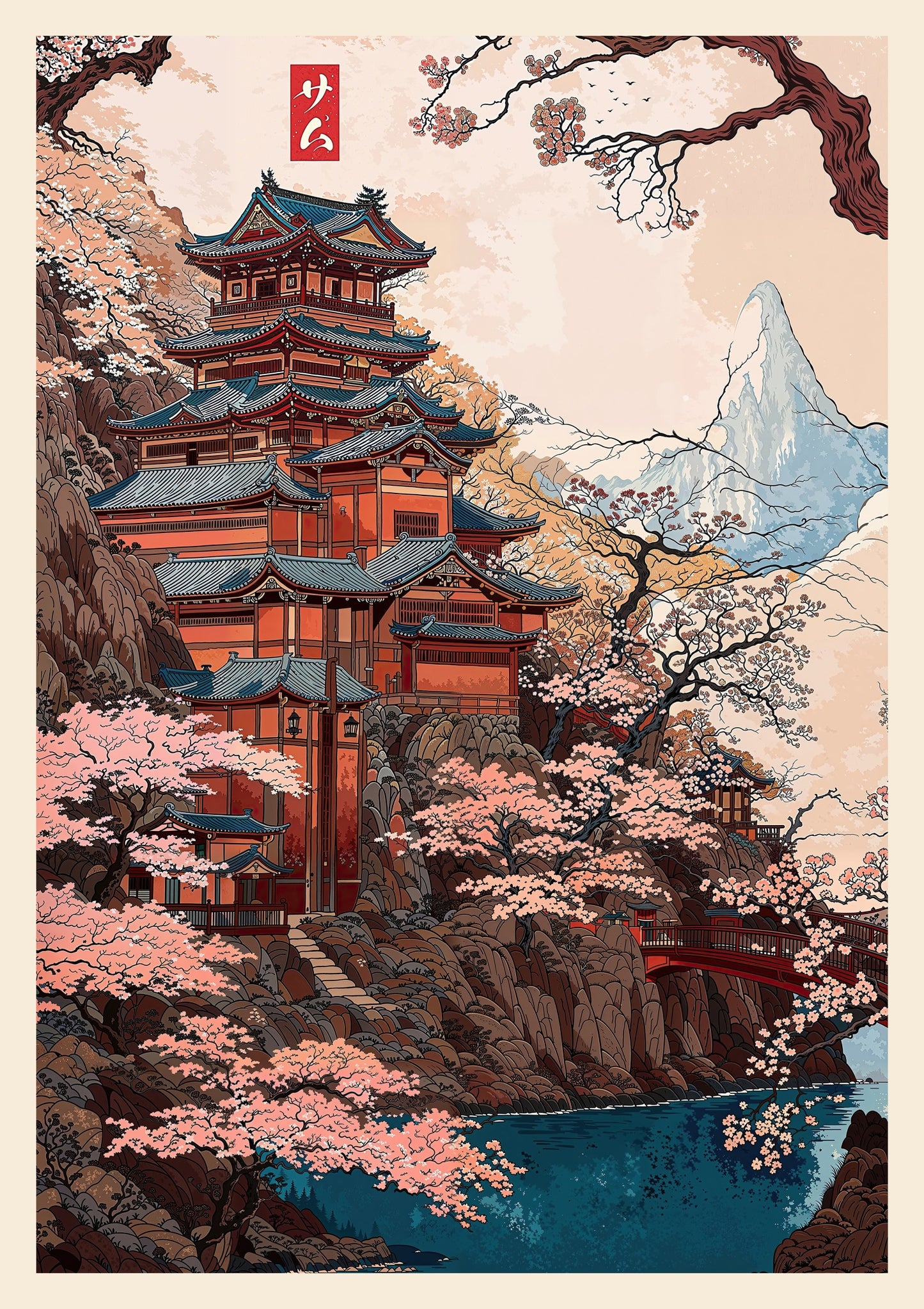 The "Yokohama Castle" poster captures a stunning illustrative landscape featuring a traditional Japanese pagoda nestled among cherry blossoms. The scene is set against a mountainous backdrop, with tranquil blue waters flowing below. This anime-style artwork beautifully blends traditional Ukiyo-E and woodblock aesthetics, showcasing the serene harmony and elegance of Japanese culture. Perfect accent for any space appreciating Japanese themes.