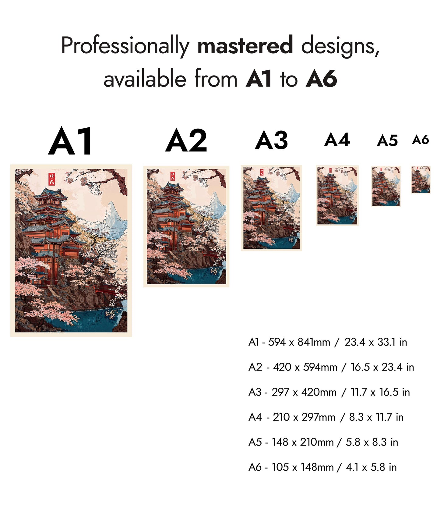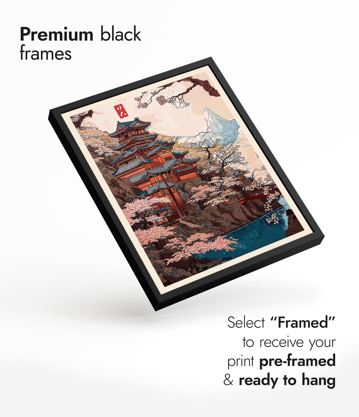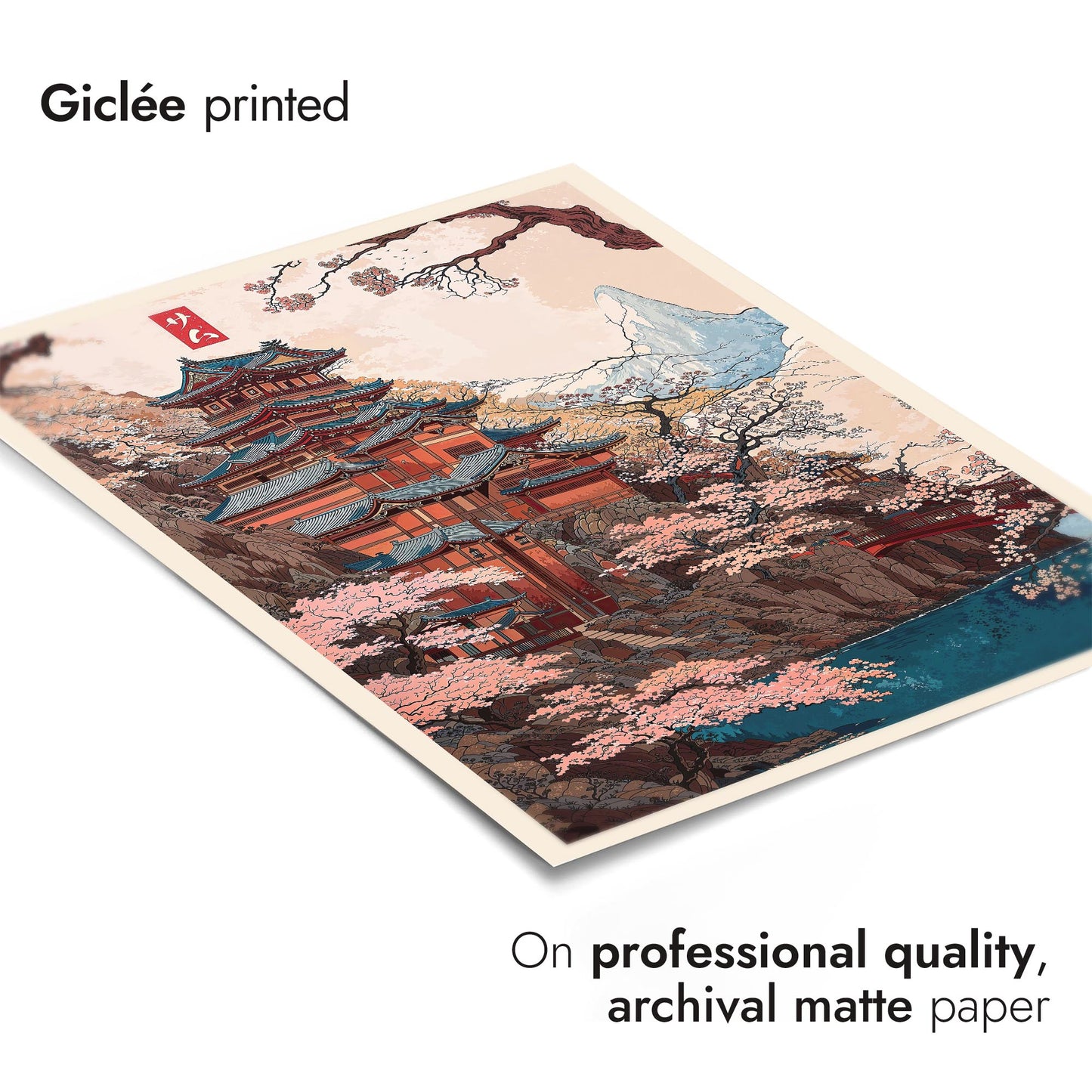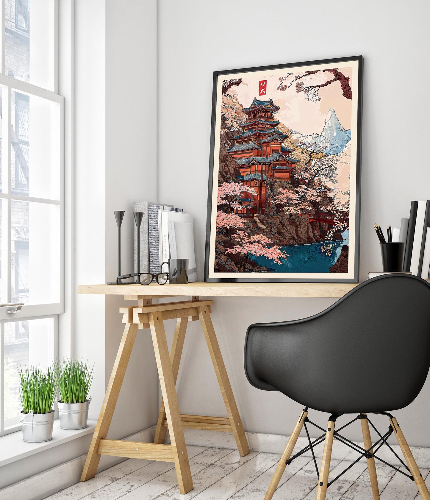 The "Yokohama Castle" poster captures a stunning illustrative landscape featuring a traditional Japanese pagoda nestled among cherry blossoms. The scene is set against a mountainous backdrop, with tranquil blue waters flowing below. This anime-style artwork beautifully blends traditional Ukiyo-E and woodblock aesthetics, showcasing the serene harmony and elegance of Japanese culture. Perfect accent for any space appreciating Japanese themes.