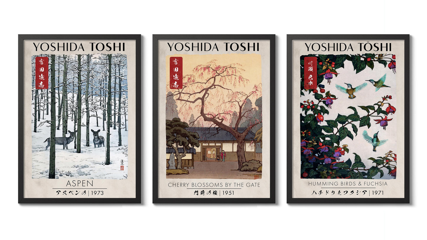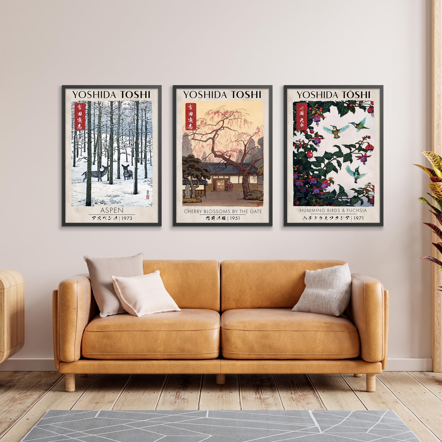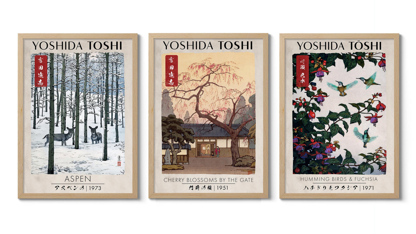 Explore the exquisite Yoshida Toshi poster set, showcasing stunning traditional Japanese woodblock prints. Featuring "Aspen" with serene woodland deer in snow, "Cherry Blossoms by the Gate" highlighting a tranquil temple scene, and "Humming Birds & Fuchsia" with vibrant birds in full bloom. Perfectly capturing nature's beauty, each poster epitomizes the rich ukiyo-e style. Ideal for art enthusiasts and traditional decor.