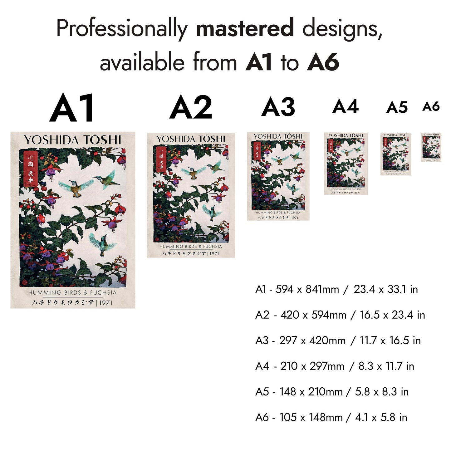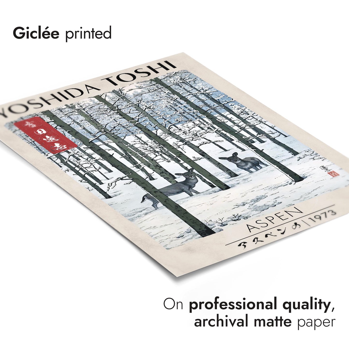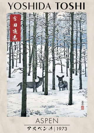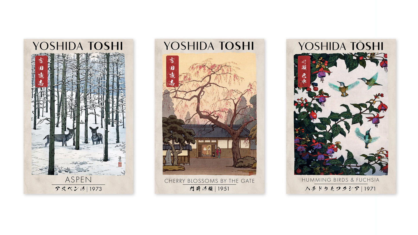 Explore the exquisite Yoshida Toshi poster set, showcasing stunning traditional Japanese woodblock prints. Featuring "Aspen" with serene woodland deer in snow, "Cherry Blossoms by the Gate" highlighting a tranquil temple scene, and "Humming Birds & Fuchsia" with vibrant birds in full bloom. Perfectly capturing nature's beauty, each poster epitomizes the rich ukiyo-e style. Ideal for art enthusiasts and traditional decor.