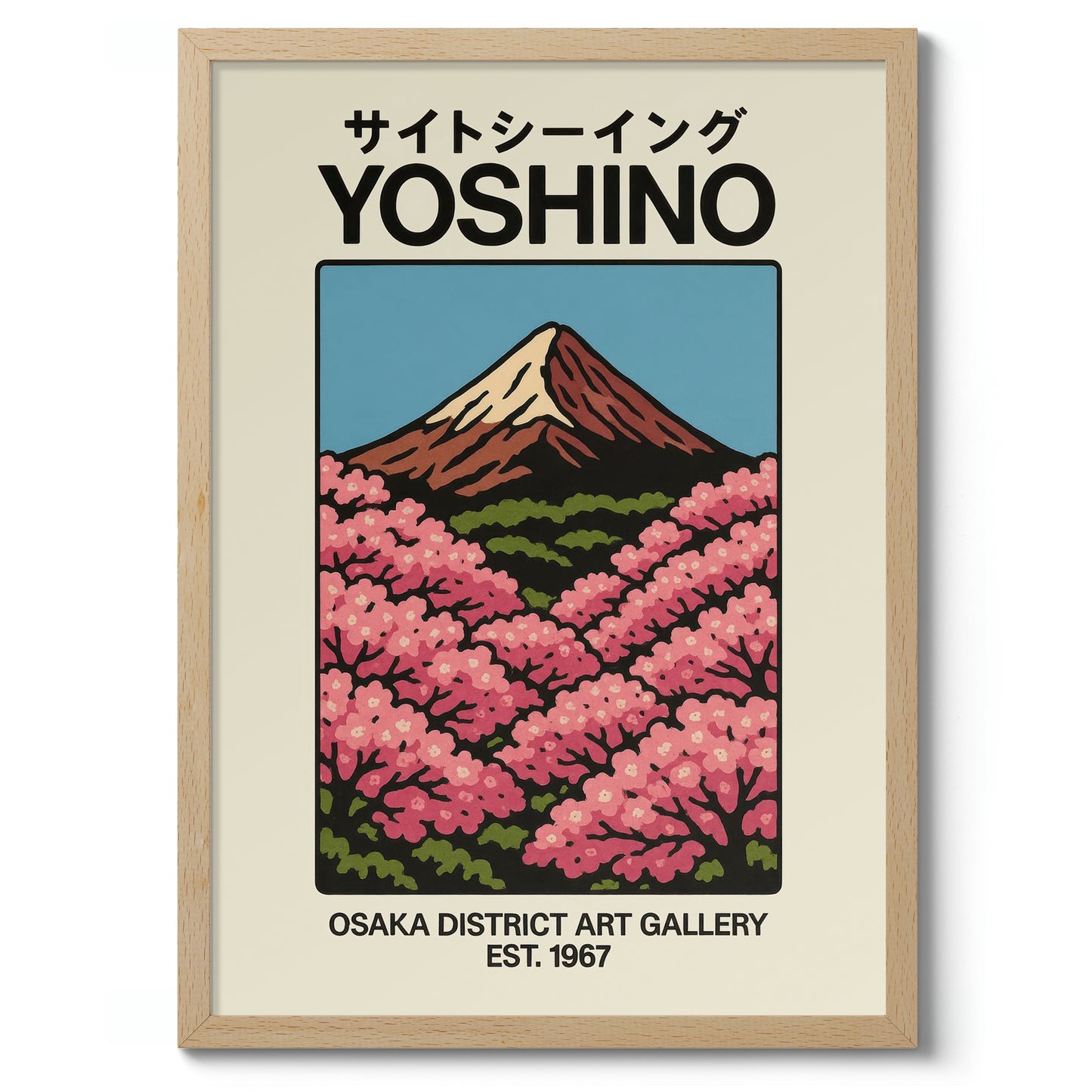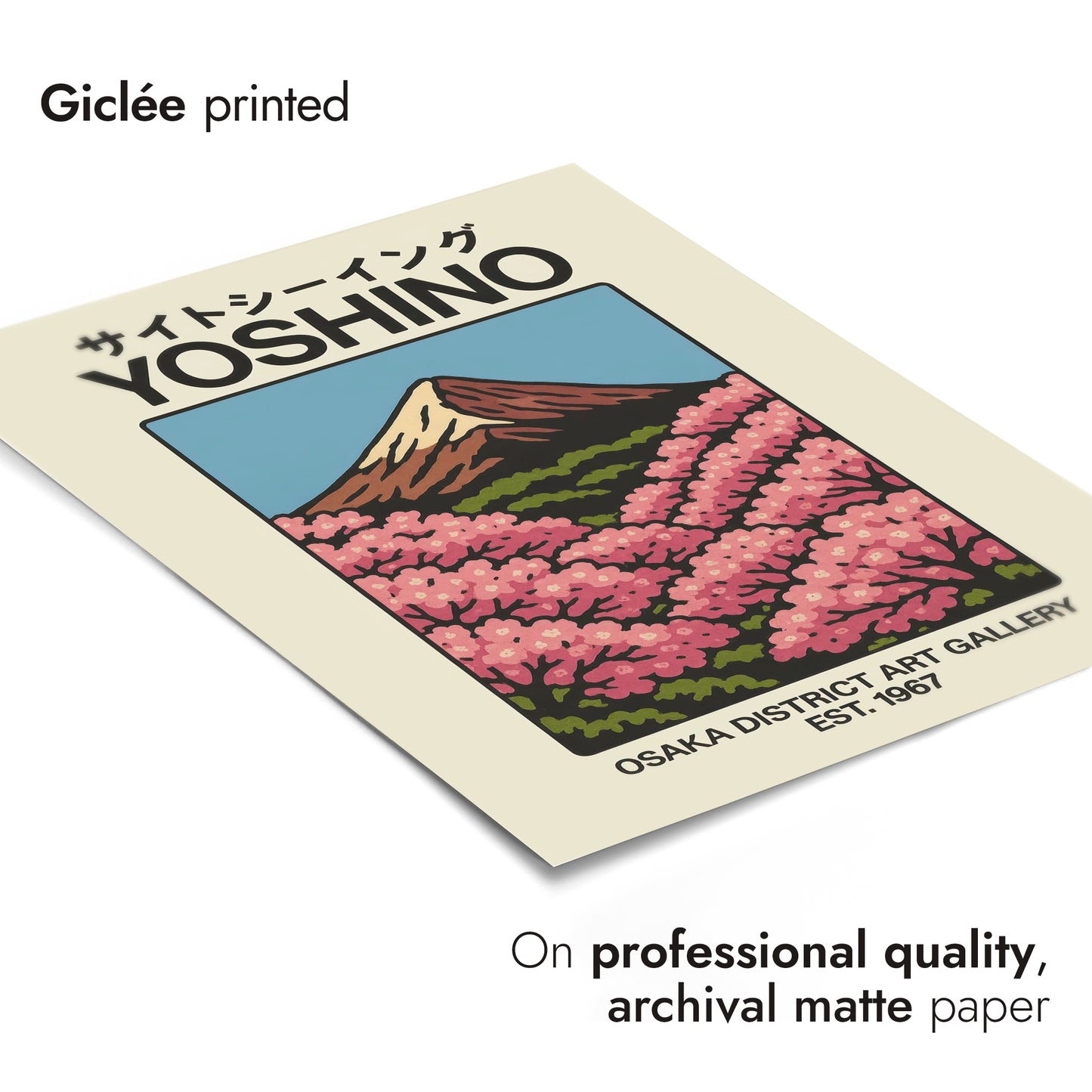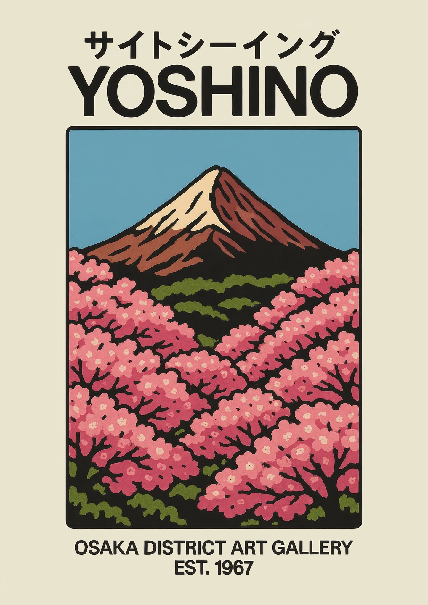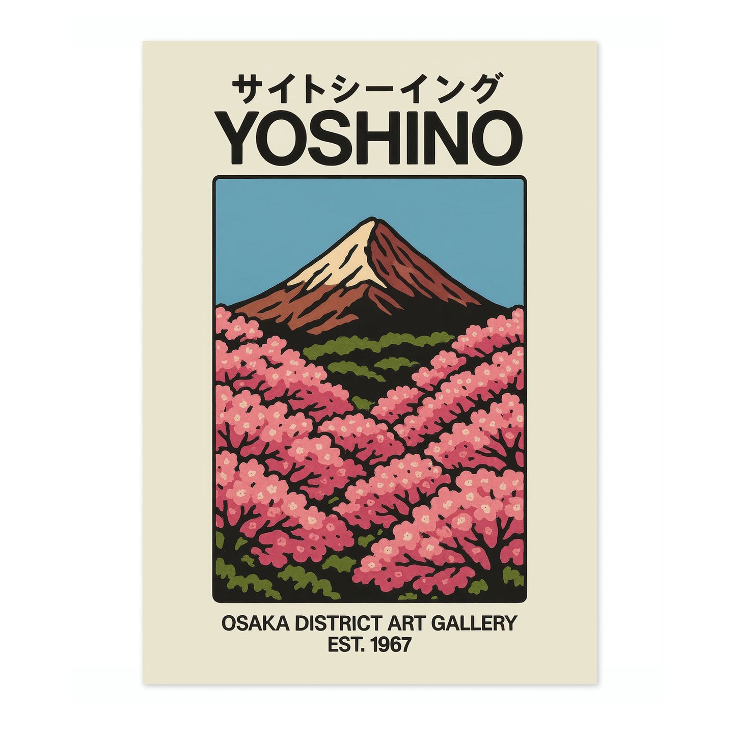 This Yoshino poster features Japan's scenic beauty, showcasing a striking mountain surrounded by lush cherry blossoms in full bloom. The vibrant pink contrasts with the earthy tones of the mountain, set against a clear blue sky. Highlighting the connections to Osaka District Art Gallery, this illustration blends traditional Japanese elements with a graphic style, perfect for art and travel enthusiasts.
