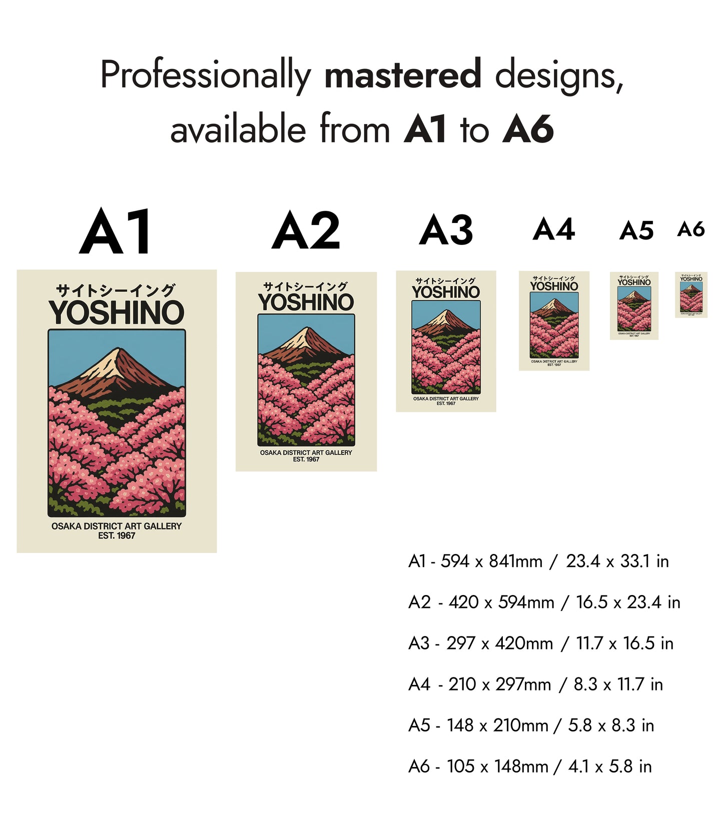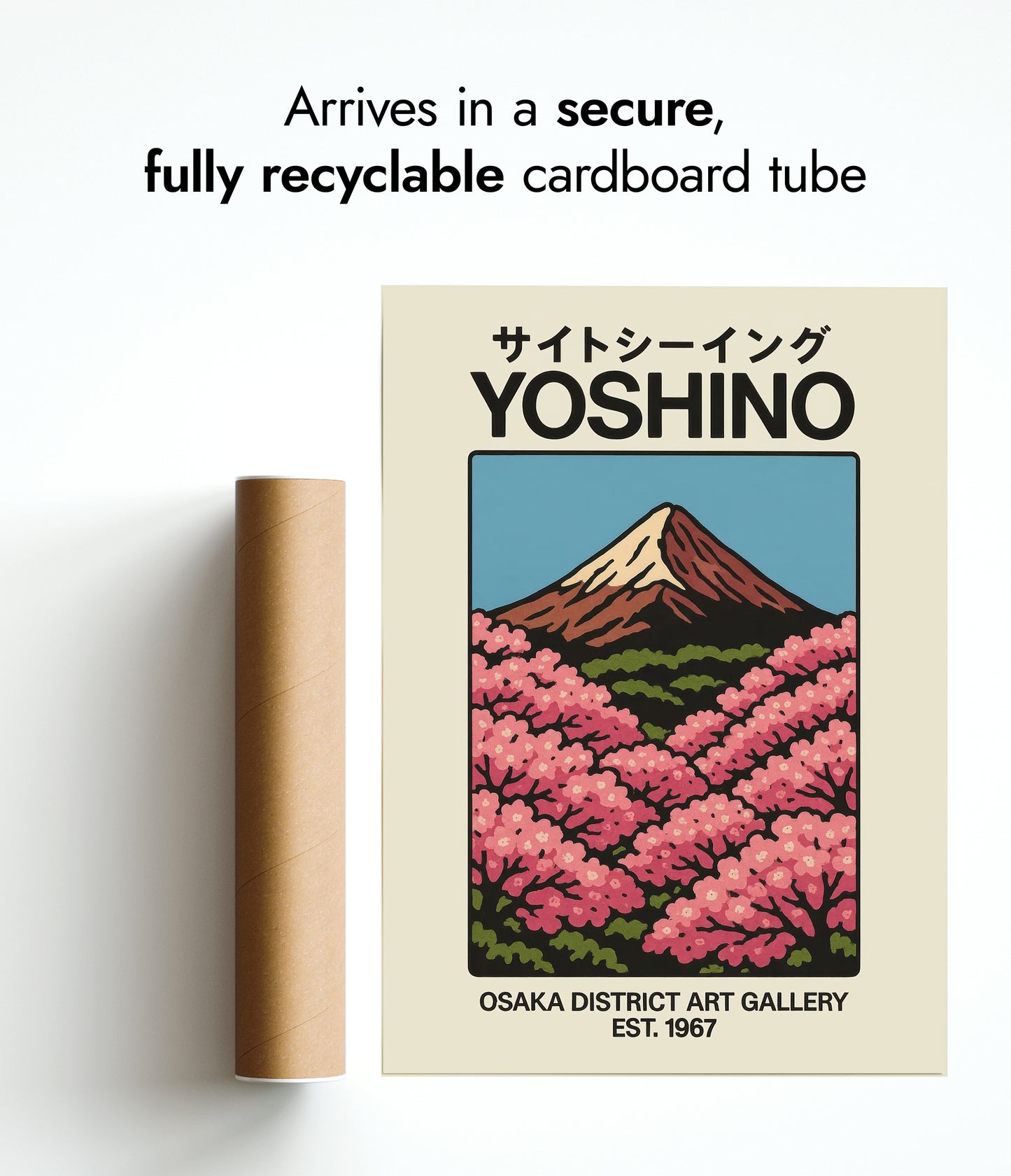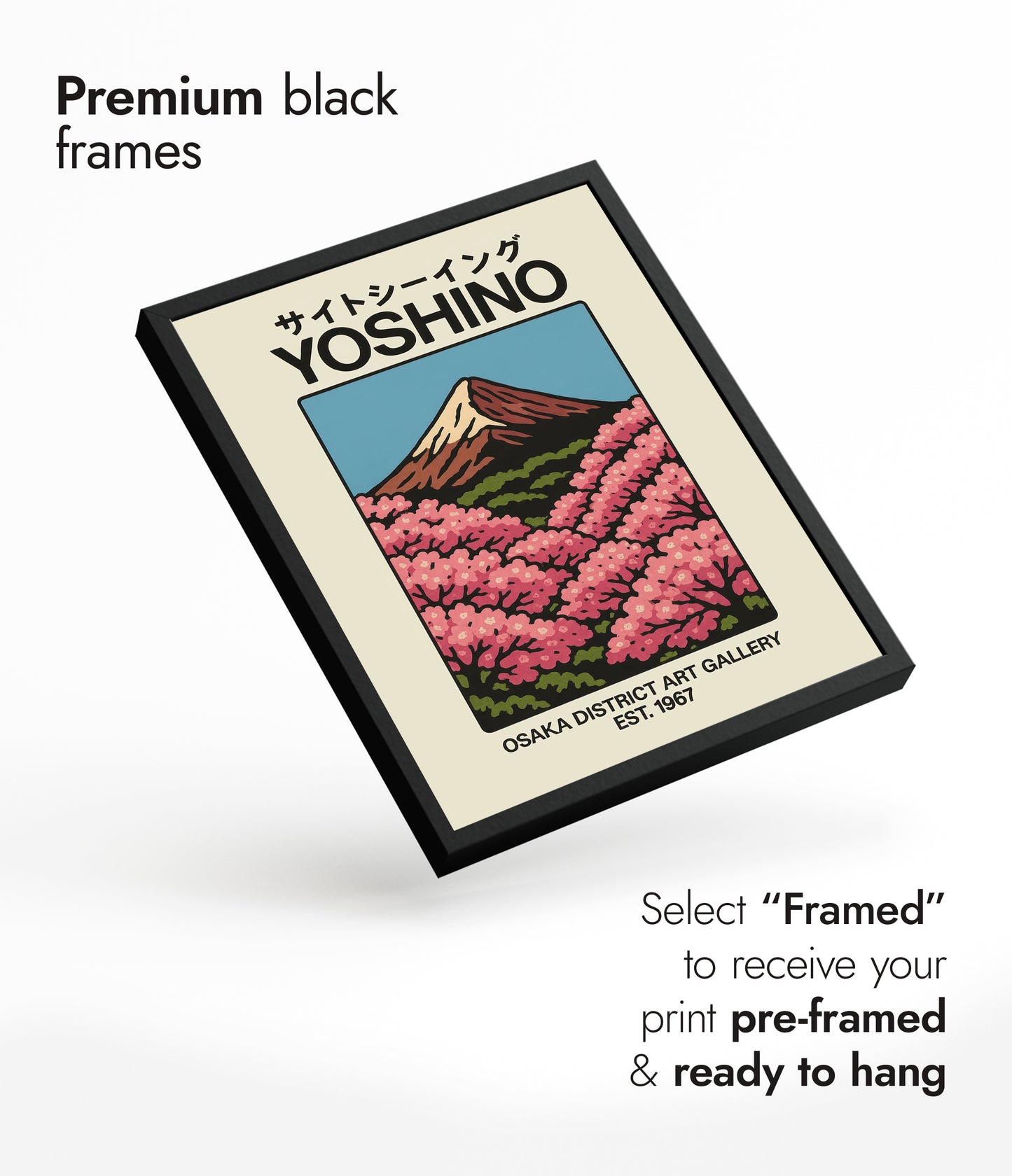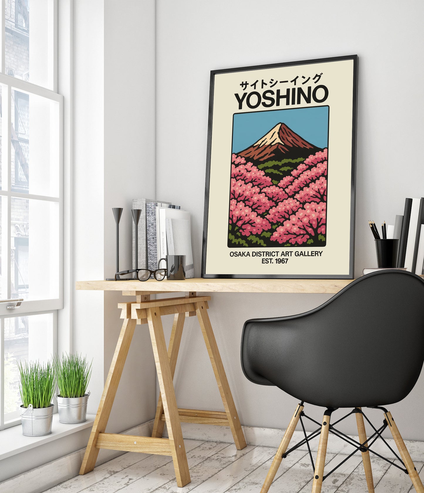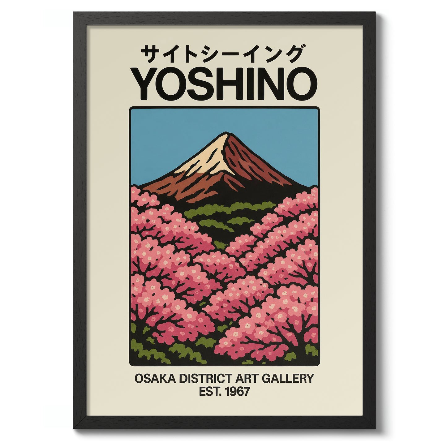 This Yoshino poster features Japan's scenic beauty, showcasing a striking mountain surrounded by lush cherry blossoms in full bloom. The vibrant pink contrasts with the earthy tones of the mountain, set against a clear blue sky. Highlighting the connections to Osaka District Art Gallery, this illustration blends traditional Japanese elements with a graphic style, perfect for art and travel enthusiasts.