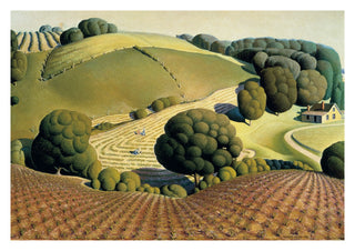 This "Young Corn" poster by Grant Wood showcases a serene rural landscape. Rolling hills ripple through the canvas, dotted with verdant trees and a quaint farmhouse. The foreground features meticulously cultivated fields, representing the essence of the American countryside. A harmonious blend of greens and earth tones captures the tranquil beauty of nature. Ideal for admirers of landscape realism in art.