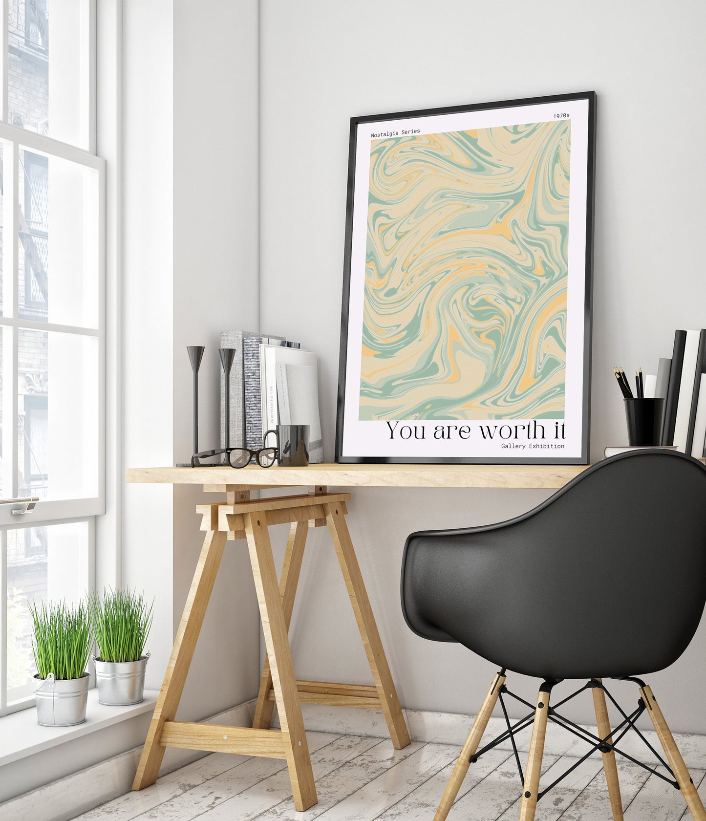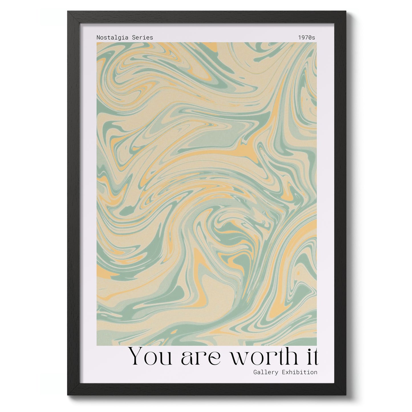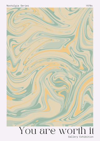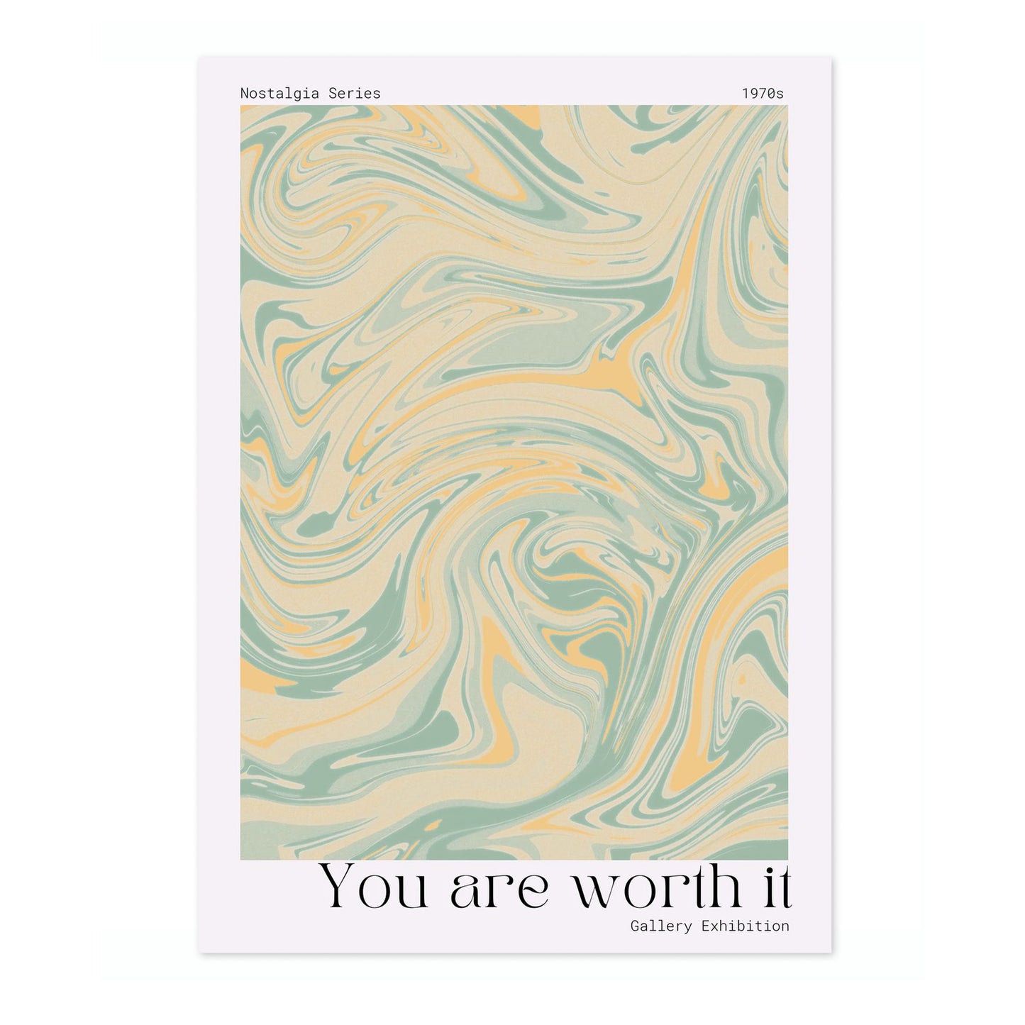 The "You Are Worth It" poster from the Nostalgia Series showcases a mesmerizing marble design with intertwining yellow and green swirls. This psychedelic illustration captures the essence of the 1970s with its fluid, hypnotic shapes, making it an excellent choice for those seeking a visually striking statement piece in modern psychedelic art for gallery-style exhibition spaces.