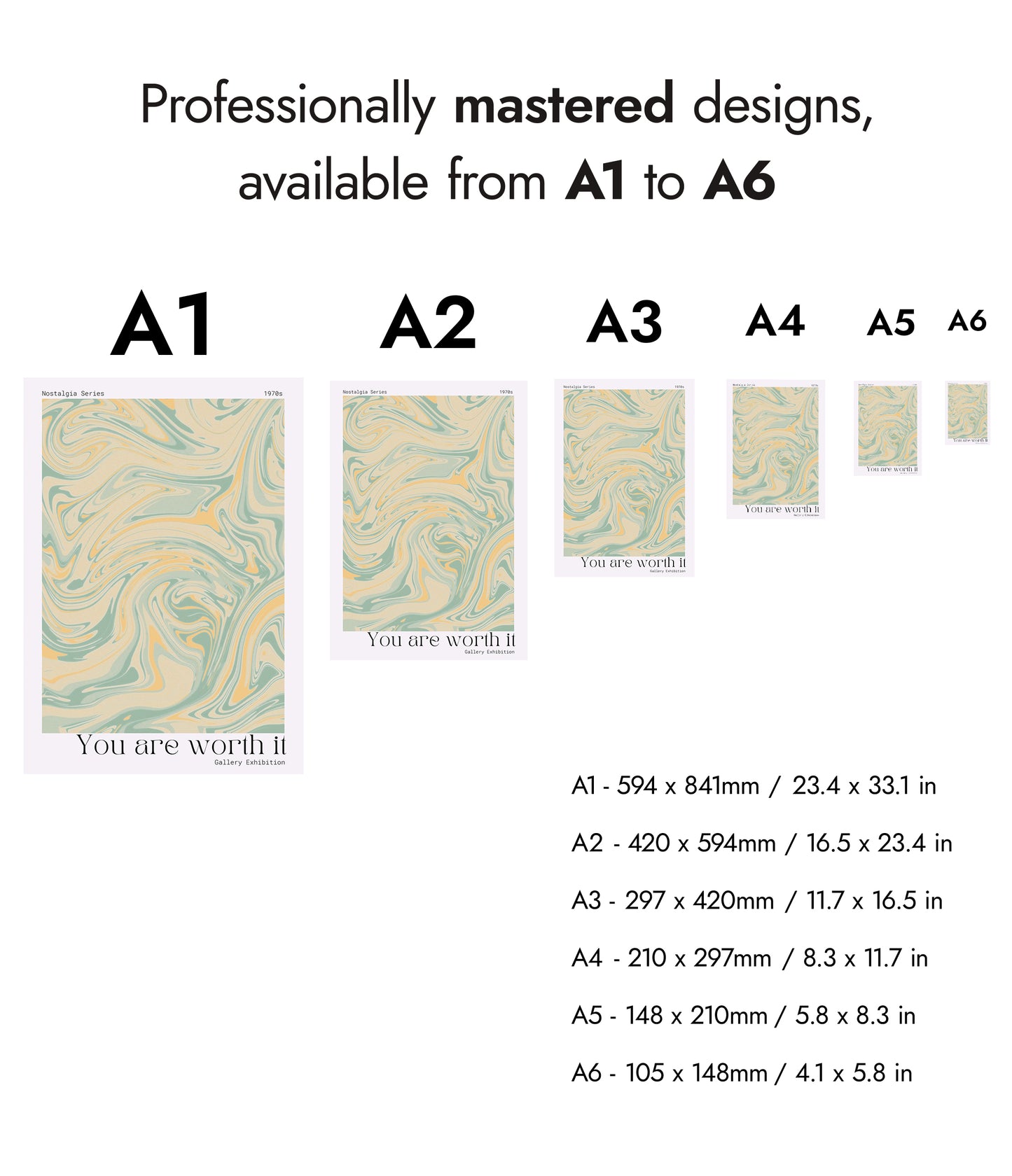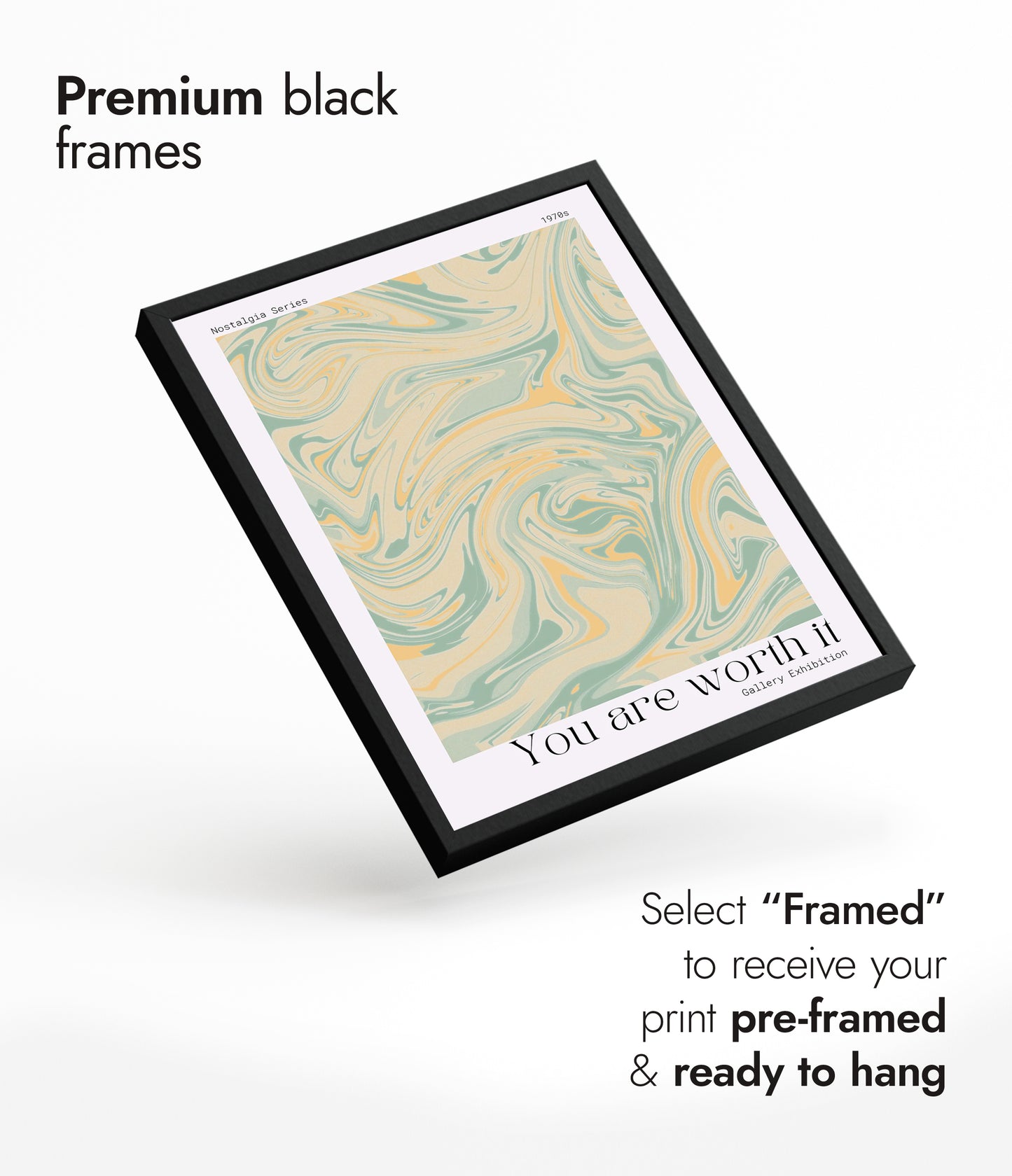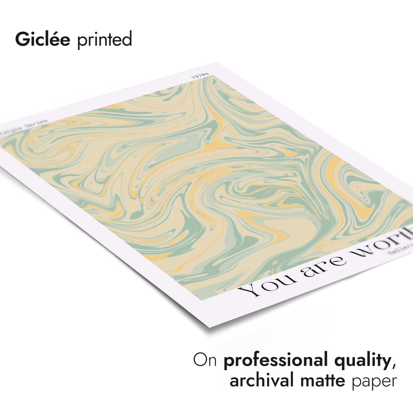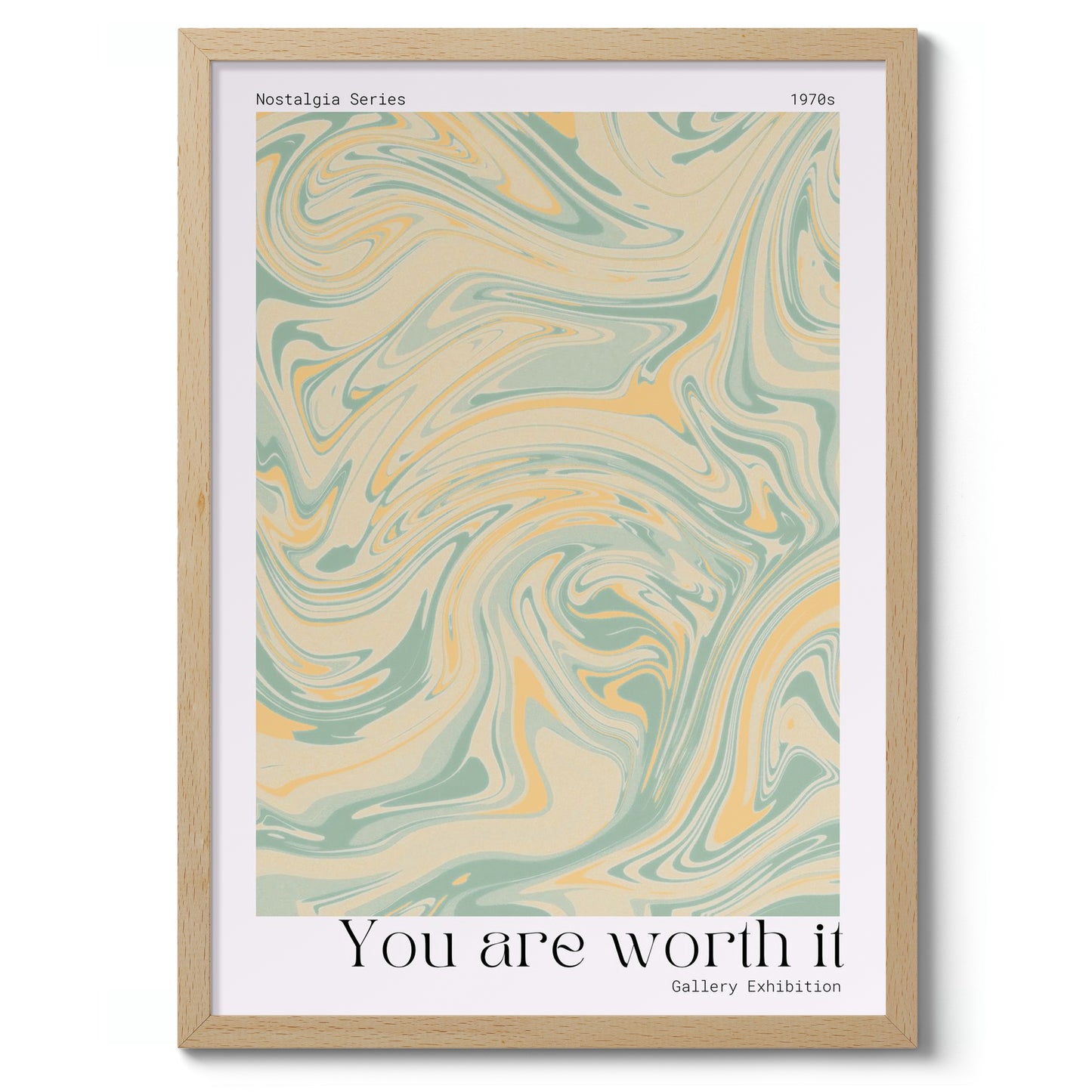 The "You Are Worth It" poster from the Nostalgia Series showcases a mesmerizing marble design with intertwining yellow and green swirls. This psychedelic illustration captures the essence of the 1970s with its fluid, hypnotic shapes, making it an excellent choice for those seeking a visually striking statement piece in modern psychedelic art for gallery-style exhibition spaces.