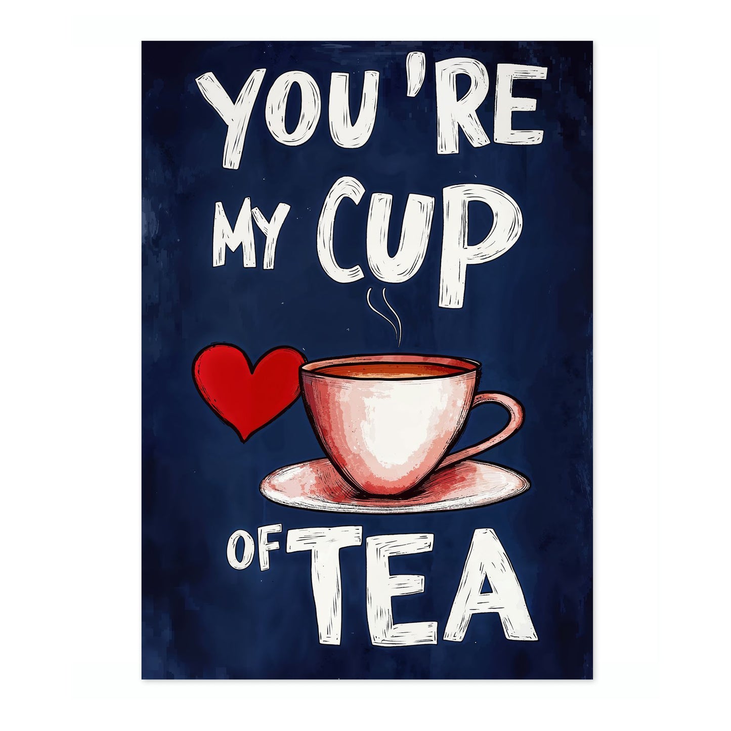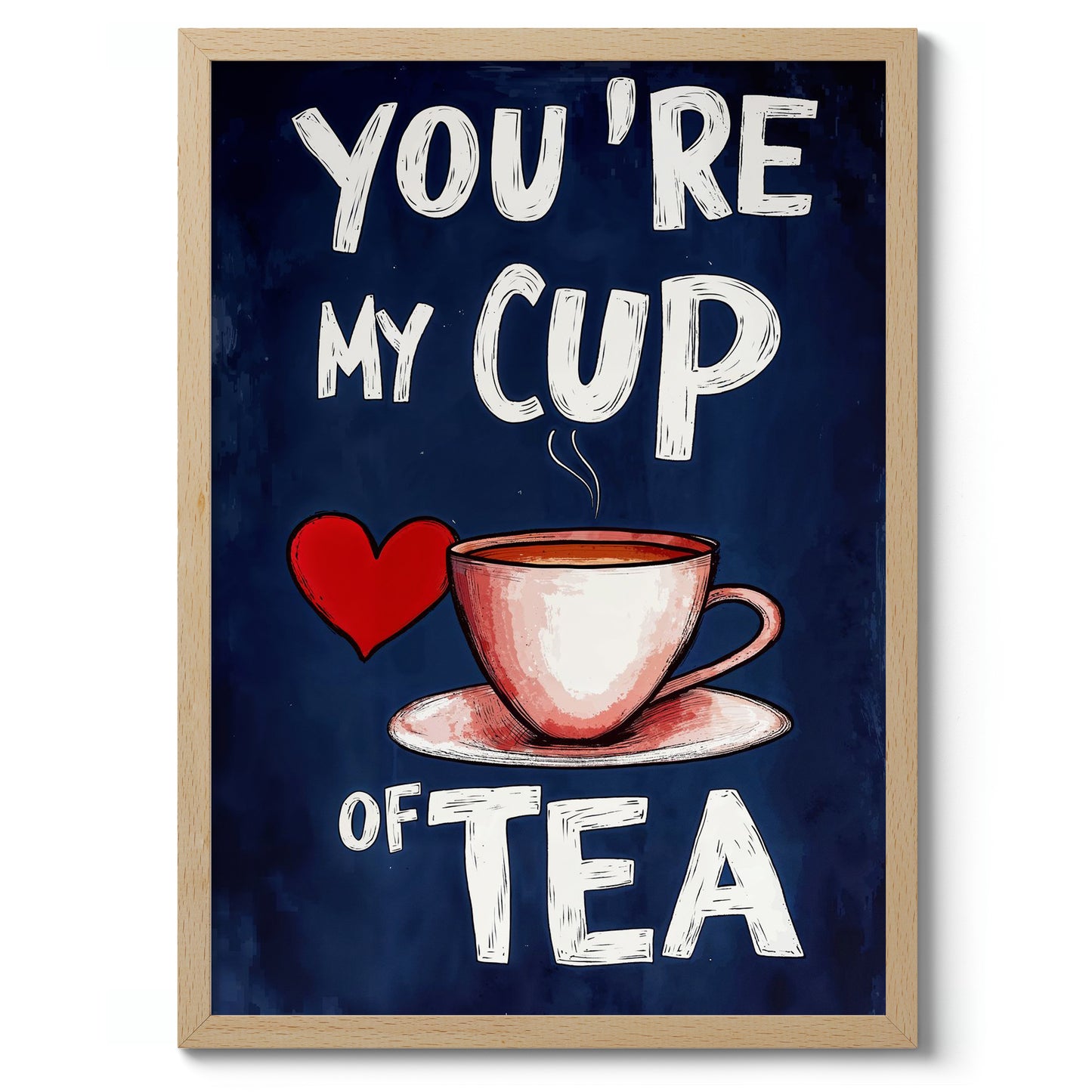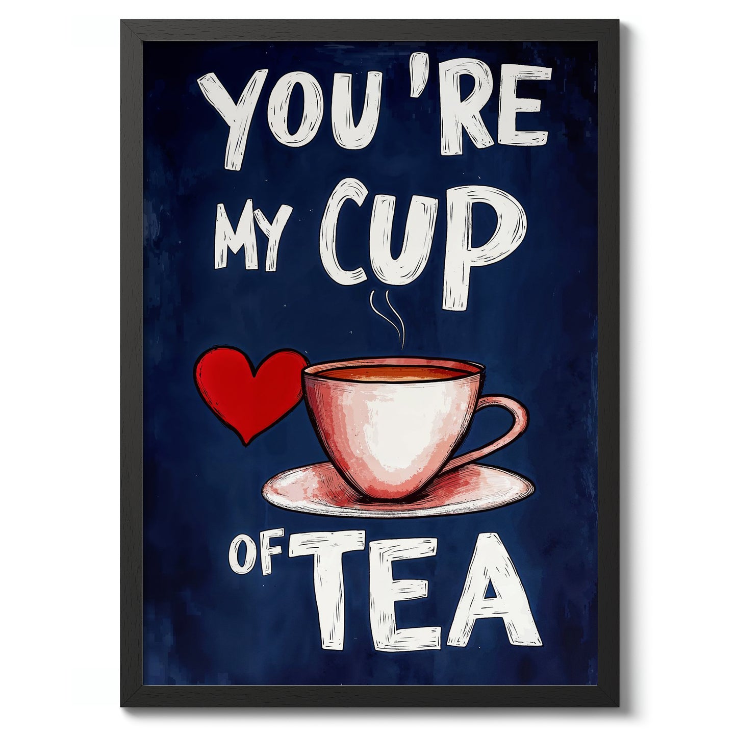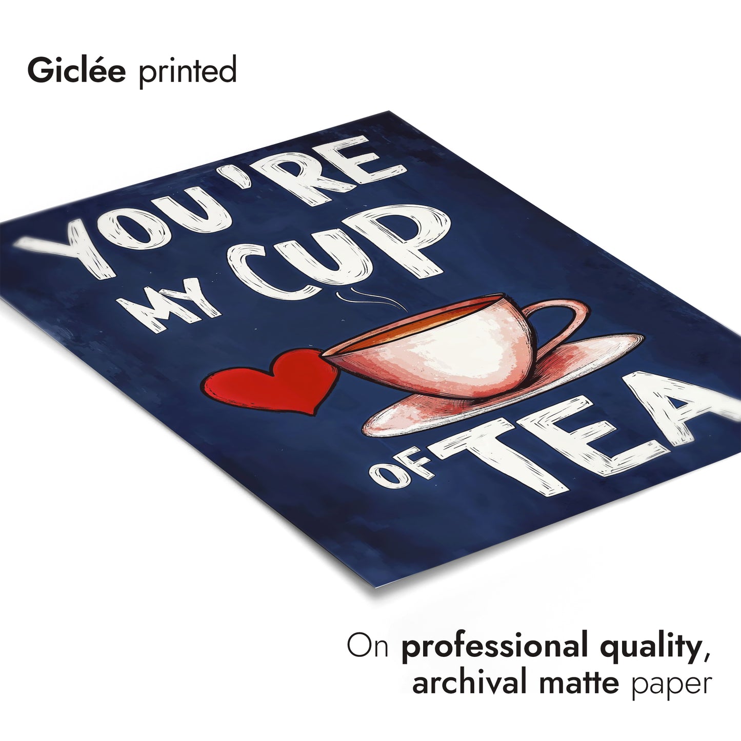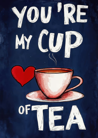 Add charm to any space with this "You're My Cup of Tea" poster. Featuring a playful typographic design with a steaming tea cup and heart on a deep blue background, this illustration radiates warmth and affection. Ideal for tea enthusiasts and lovers of whimsical decor, offering a touch of cozy sentiment to kitchens or living areas.