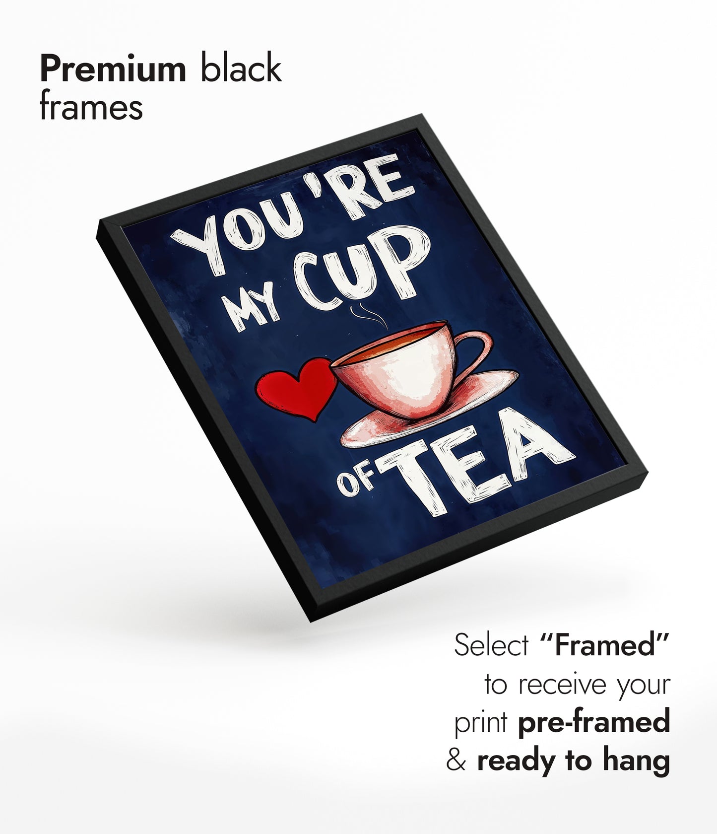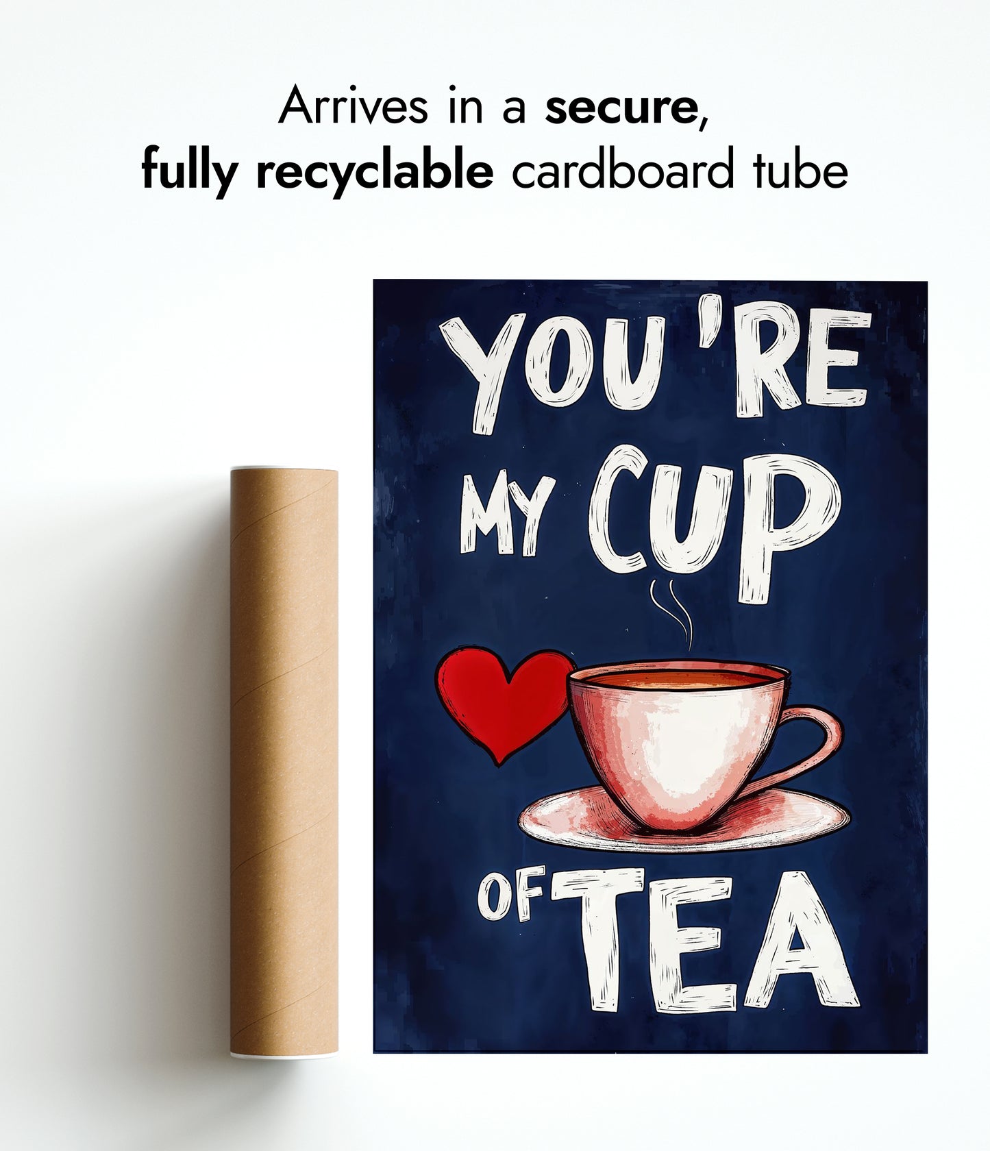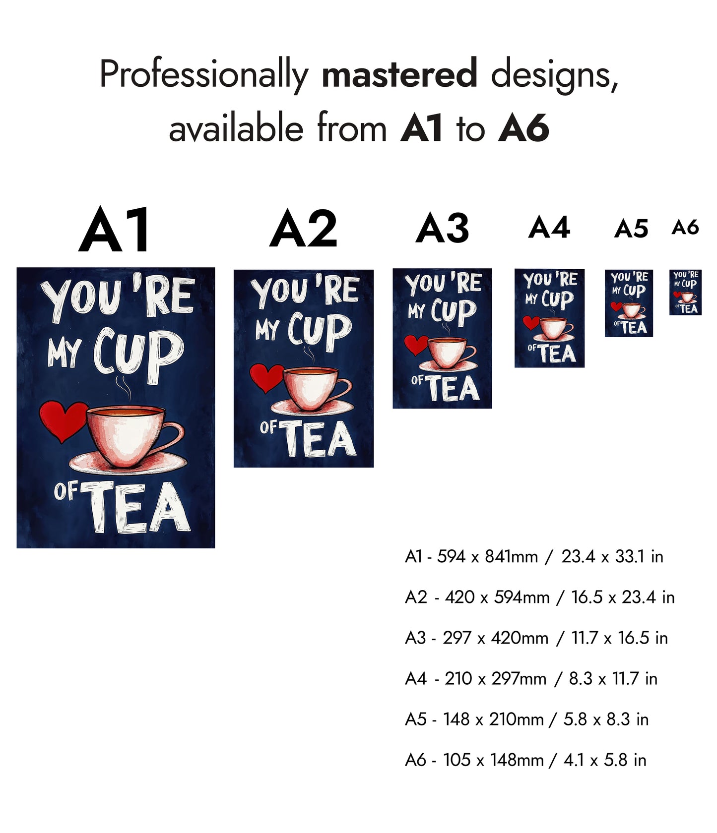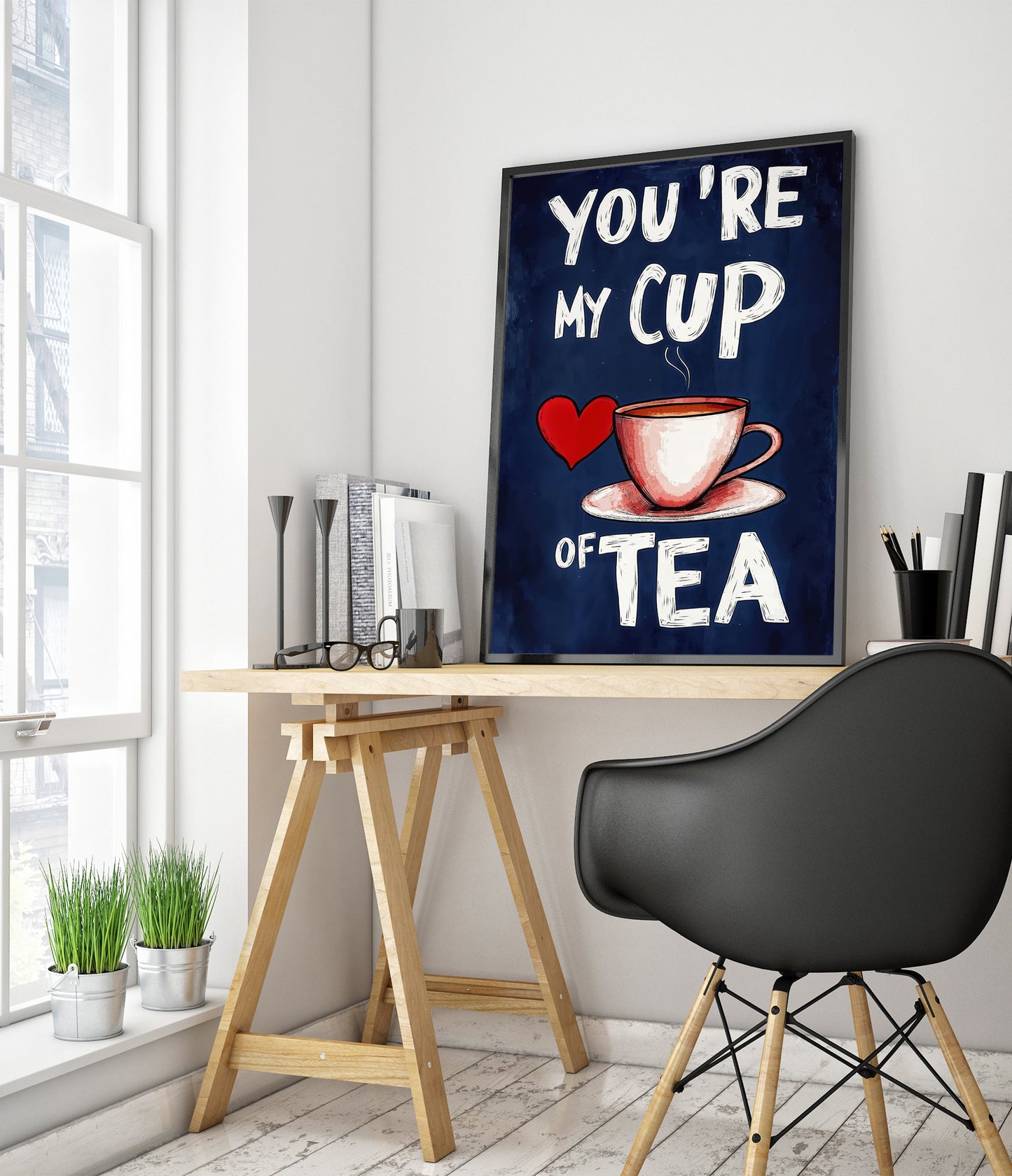 Add charm to any space with this "You're My Cup of Tea" poster. Featuring a playful typographic design with a steaming tea cup and heart on a deep blue background, this illustration radiates warmth and affection. Ideal for tea enthusiasts and lovers of whimsical decor, offering a touch of cozy sentiment to kitchens or living areas.