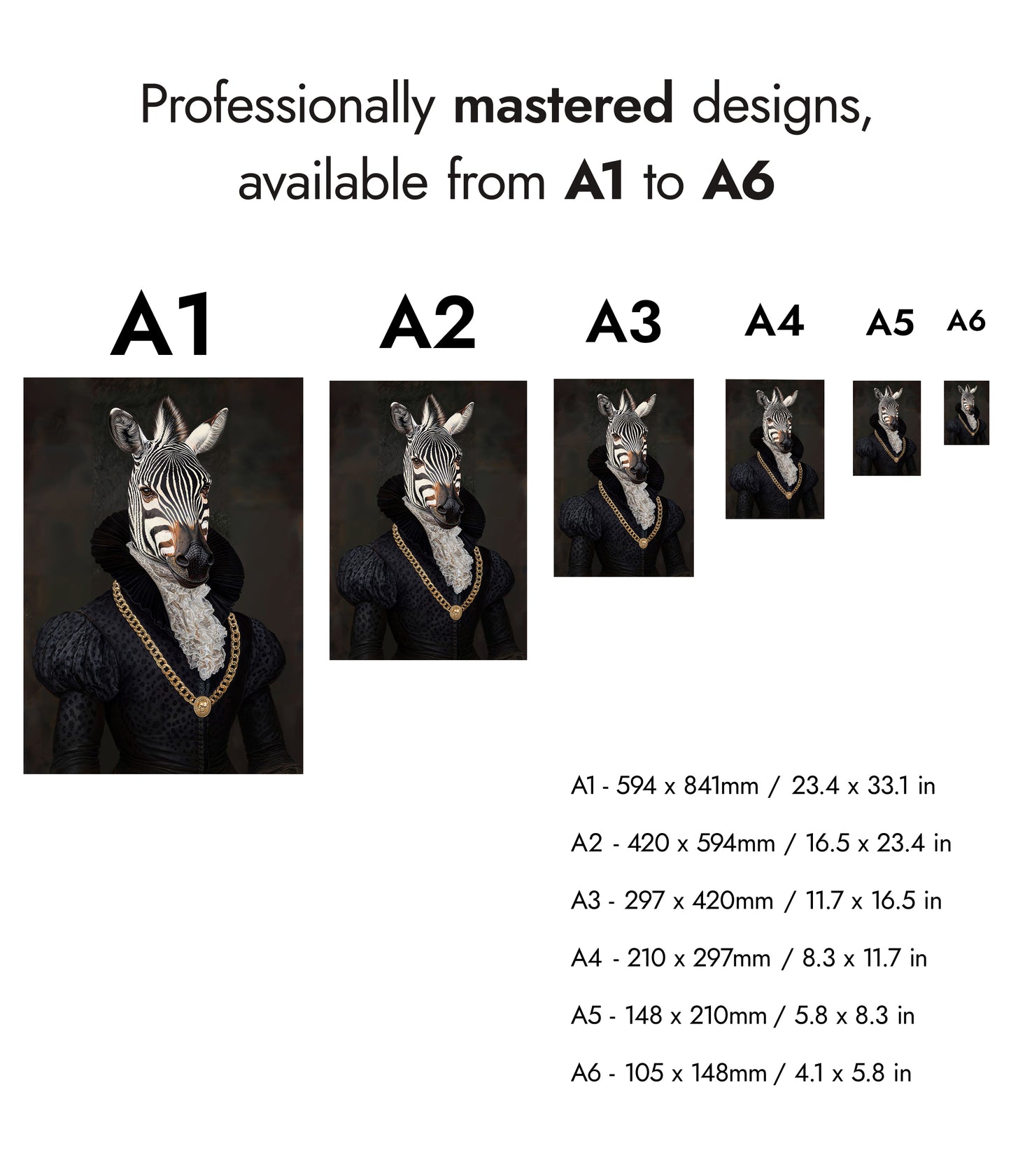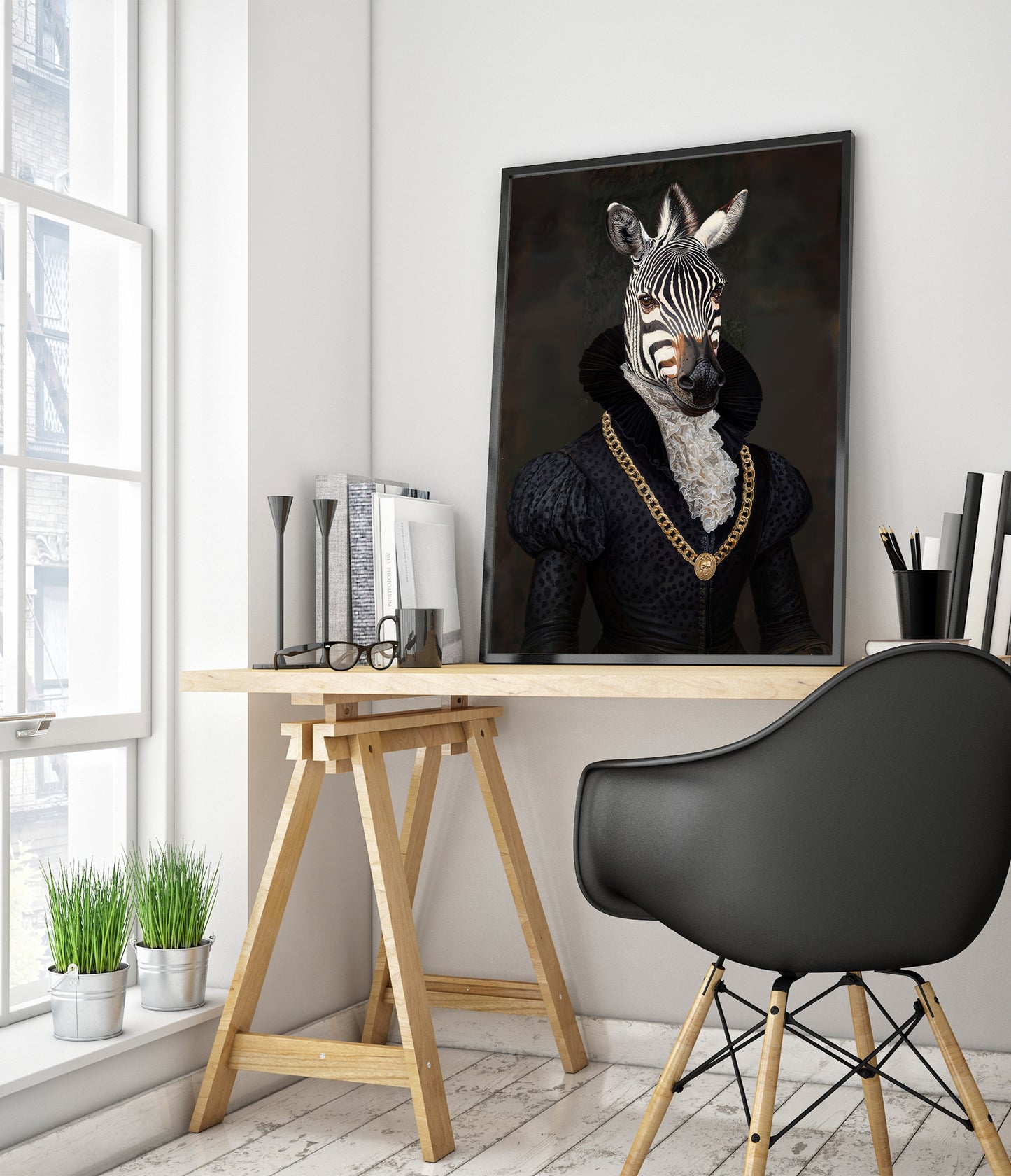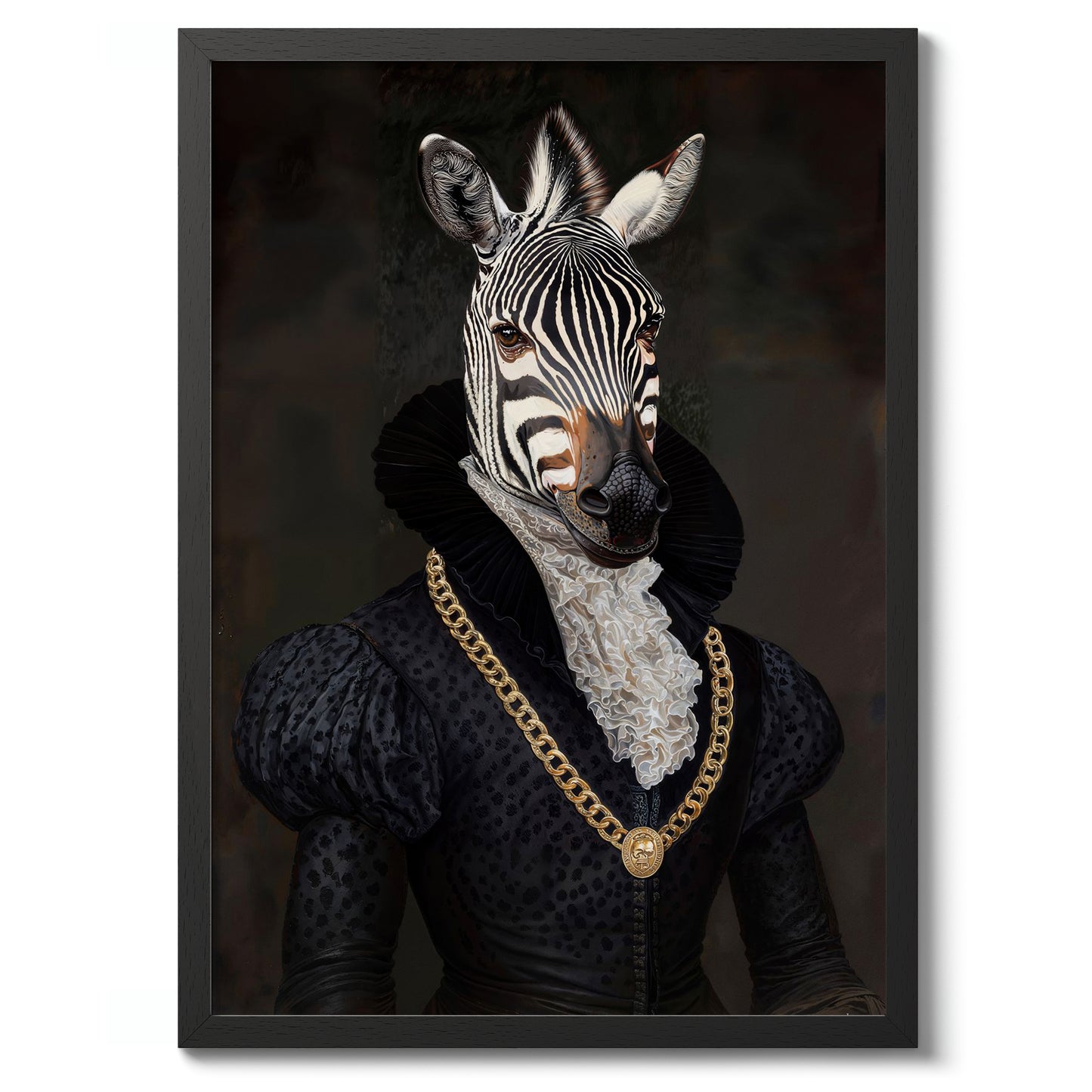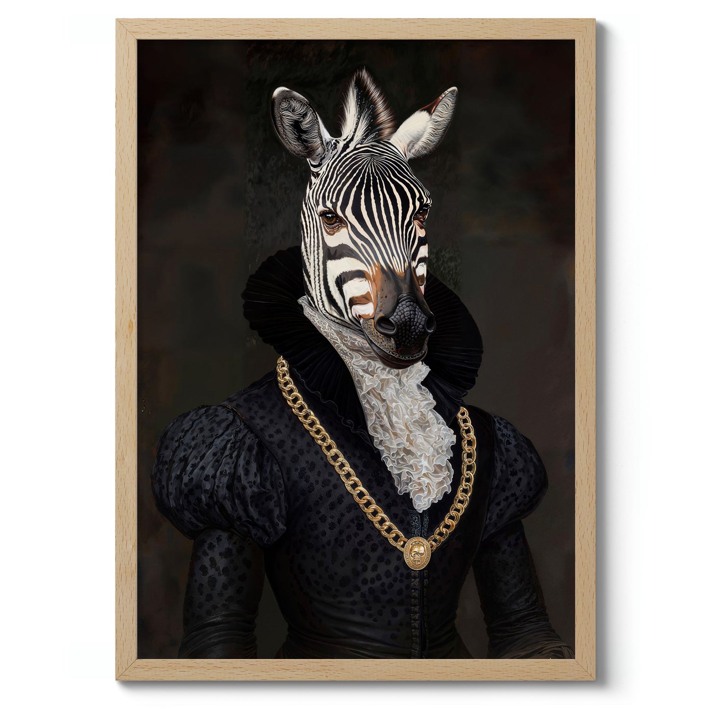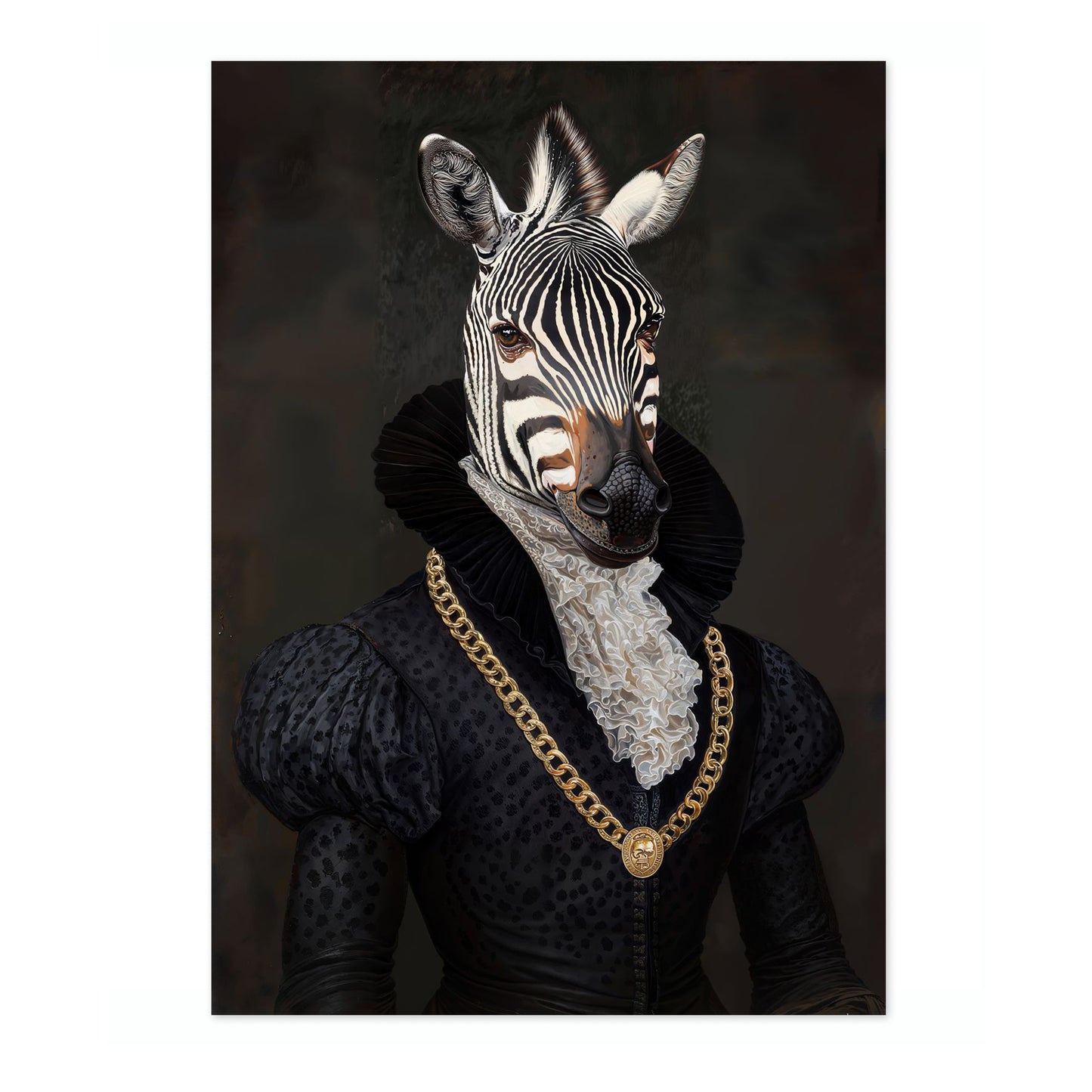 This quirky art print showcases a zebra in regal Tudor attire, blending historical costume with modern humor. The zebra's striking stripes contrast with its delicate ruffled collar and ornate gold chain, creating a charming and whimsical vibe. Ideal for those seeking a unique animal poster that combines vintage elegance with playful creativity, making it a standout addition to eclectic spaces.