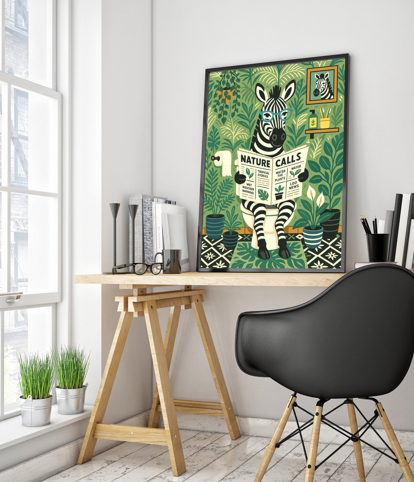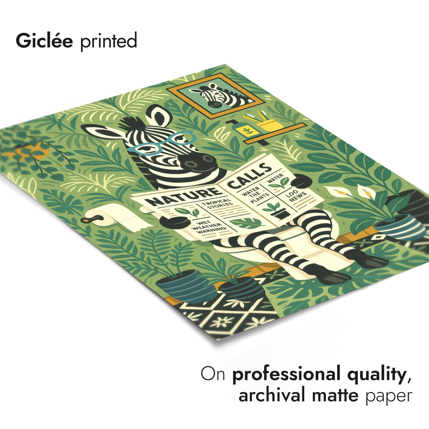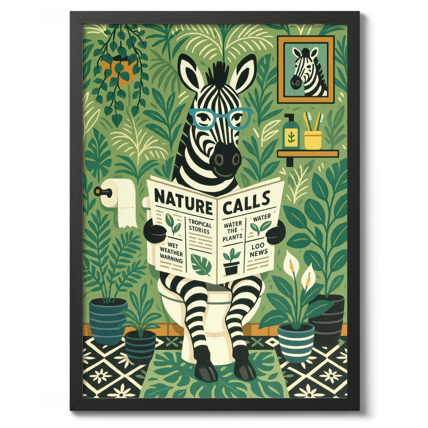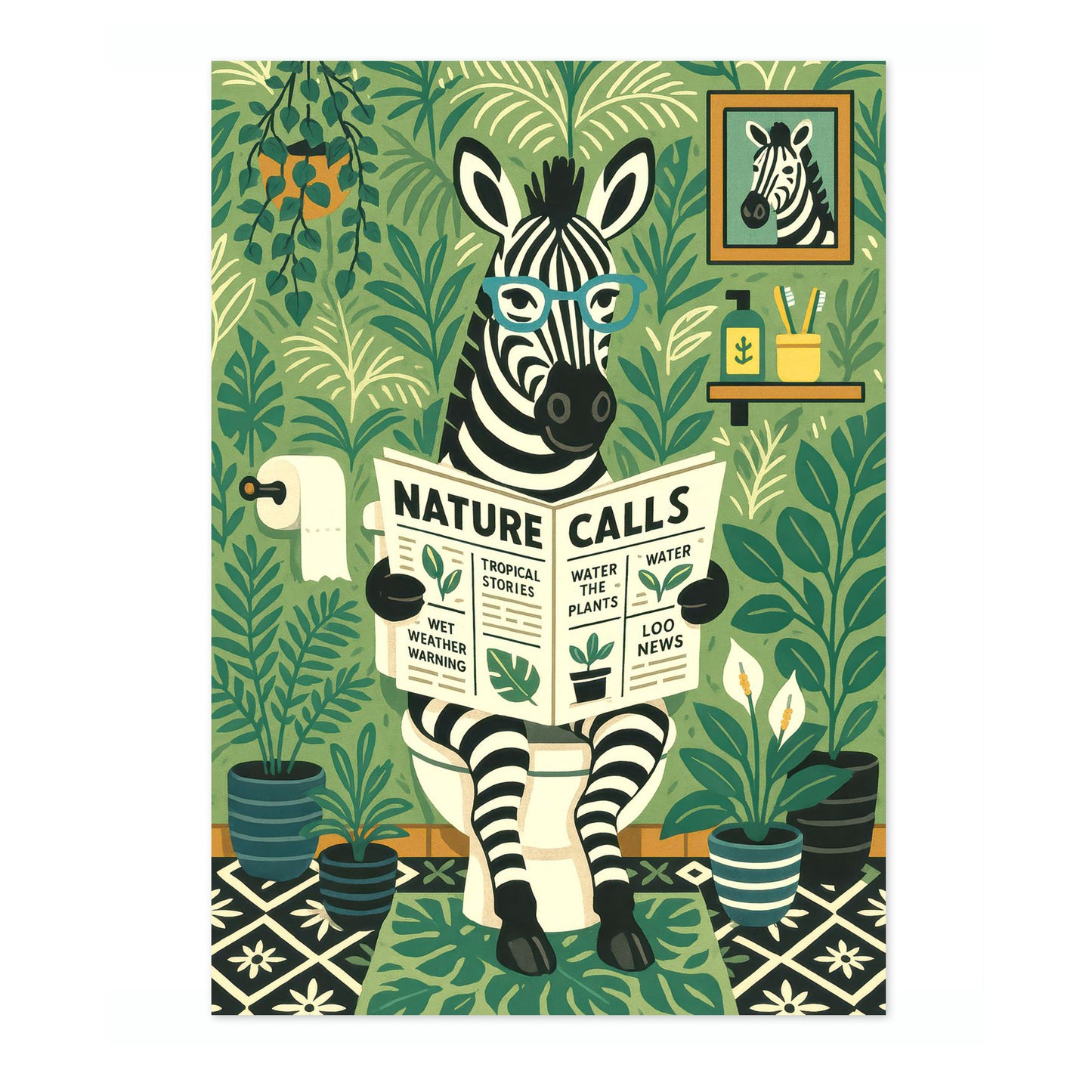 The "Zebra Toilet" poster features a whimsical zebra, sitting on a toilet, engrossed in a newspaper titled "Nature Calls." Surrounded by lush, vibrant greenery, the zebra wears glasses, adding a quirky touch. The framed zebra portrait and potted plants enhance the playful theme, while the green hues evoke a sense of nature in this delightful bathroom scene.