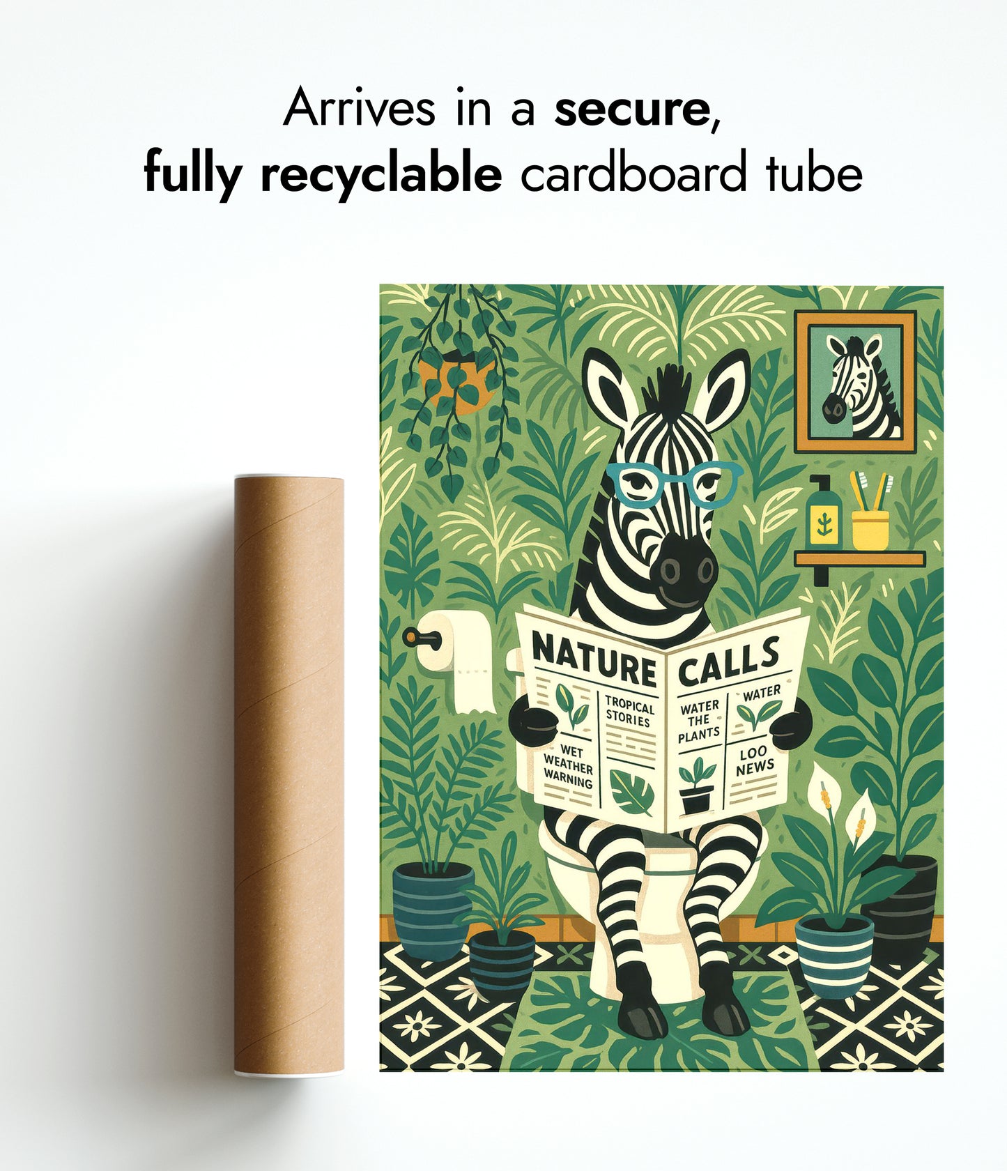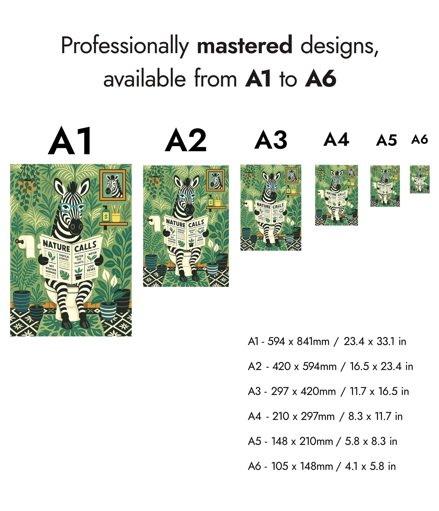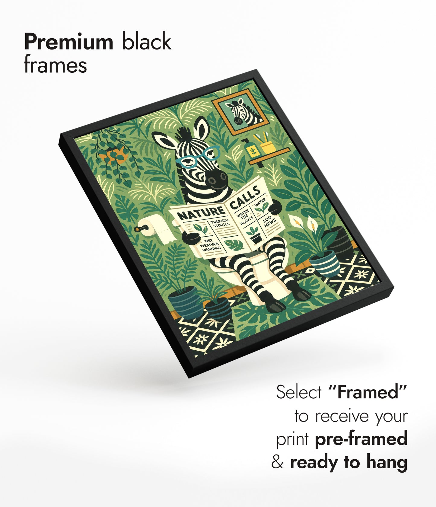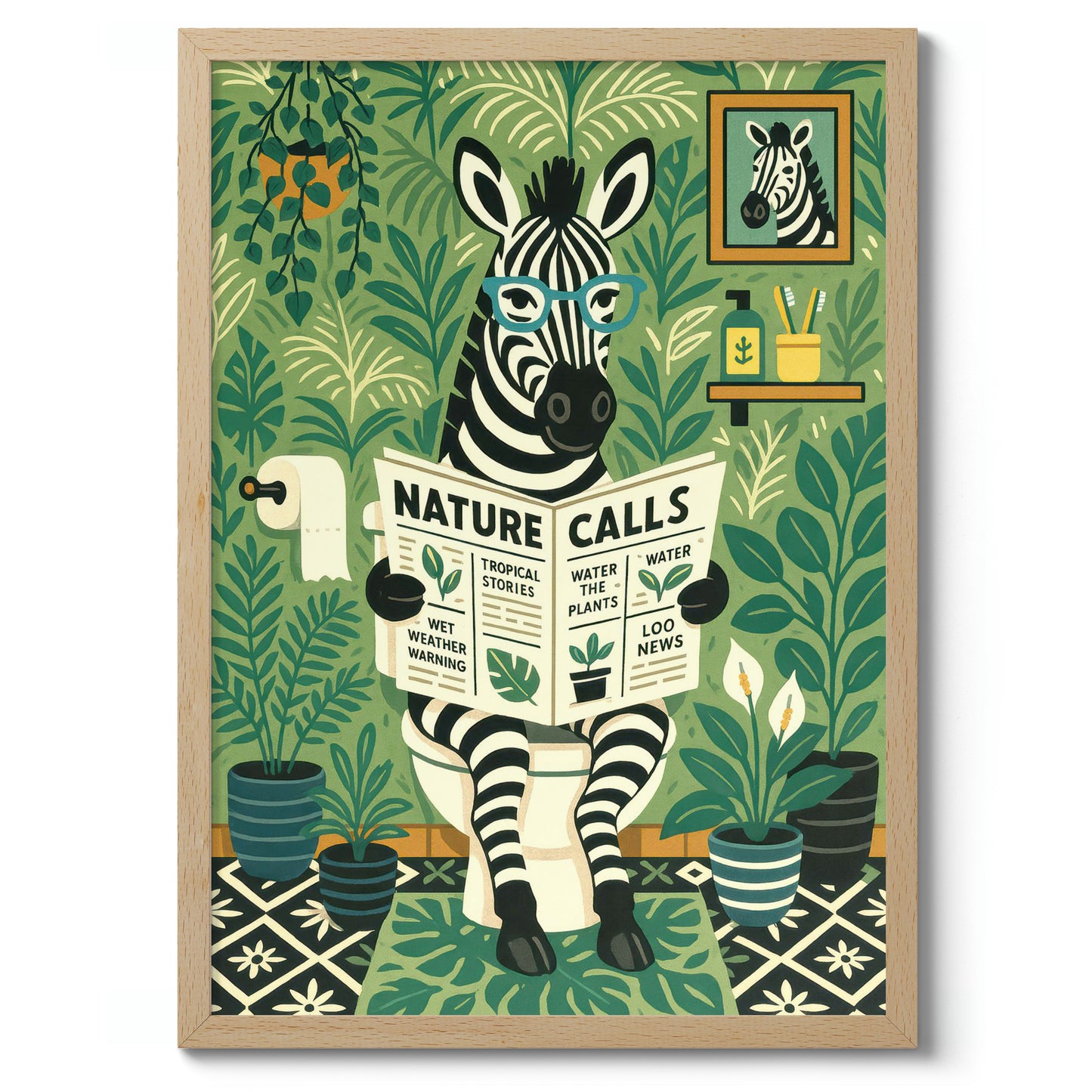 The "Zebra Toilet" poster features a whimsical zebra, sitting on a toilet, engrossed in a newspaper titled "Nature Calls." Surrounded by lush, vibrant greenery, the zebra wears glasses, adding a quirky touch. The framed zebra portrait and potted plants enhance the playful theme, while the green hues evoke a sense of nature in this delightful bathroom scene.