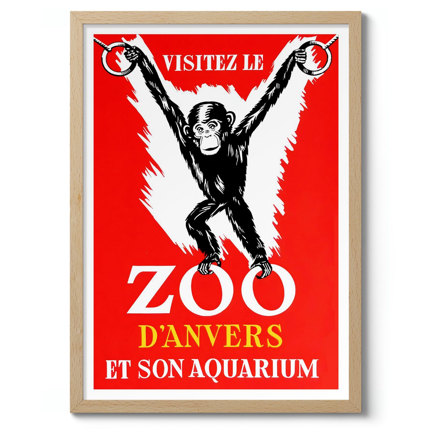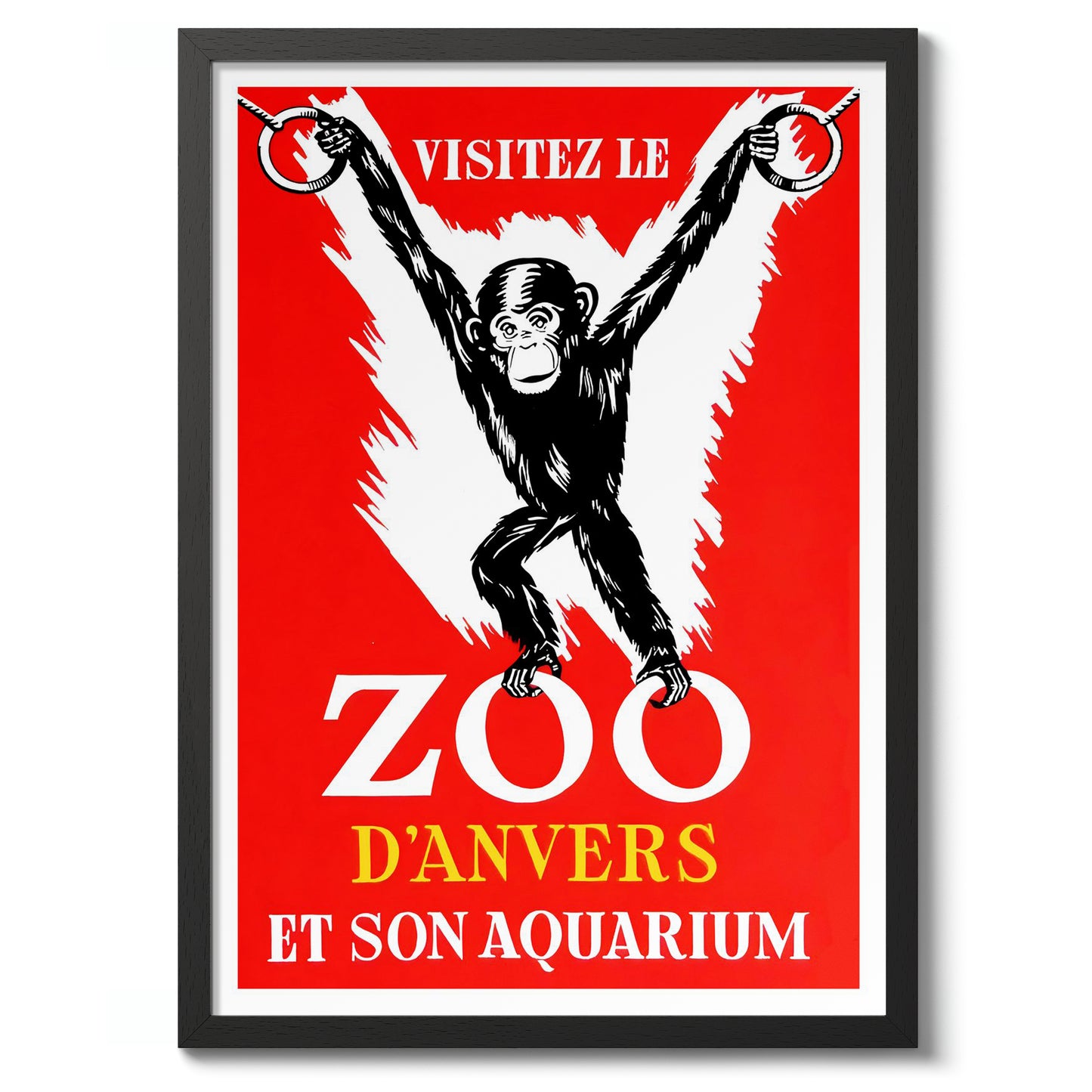 This vintage poster titled "Zoo d'Anvers" captures a playful monkey swinging on red and white ropes with bold text urging visitors to explore the Antwerp Zoo and its aquarium. The graphic illustration is striking in its simplicity, utilizing a vivid red background to draw attention. Ideal for enthusiasts of vintage French advertising and animal-themed decor.