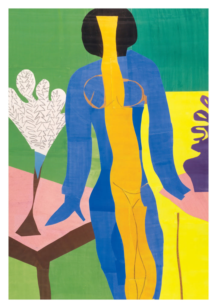 This "Zulma" poster by Henri Matisse showcases a colourful and abstract portrait of a nude woman set against a vivid background. The figure, rendered in striking blue and yellow tones, stands beside a vase with white flowers. Matisse’s bold use of collaged elements and varied textures creates a visually captivating piece, embodying his signature style. Ideal for modern art enthusiasts.